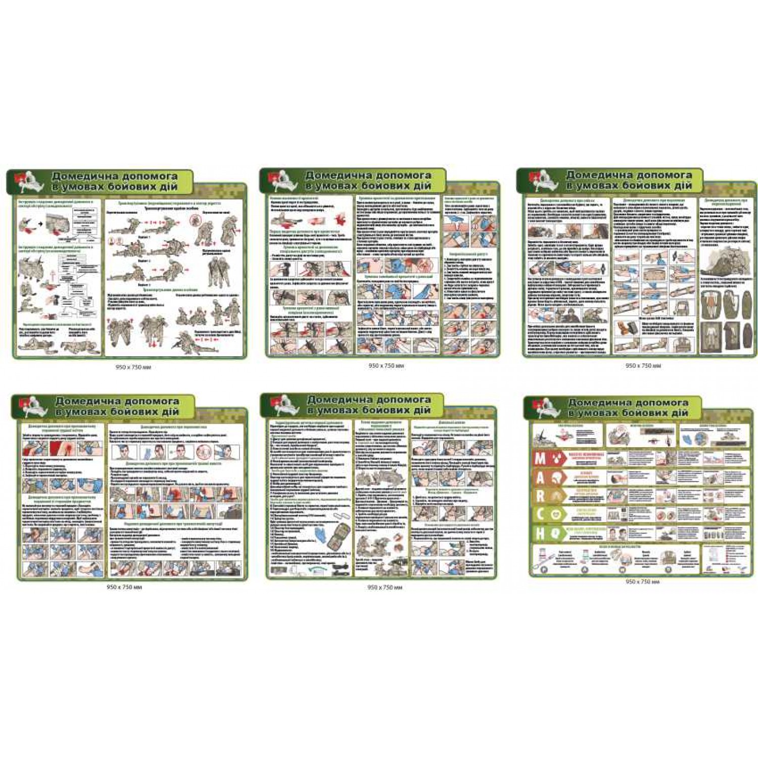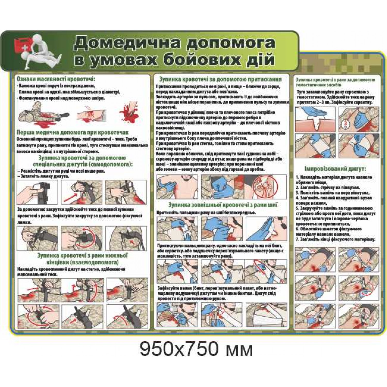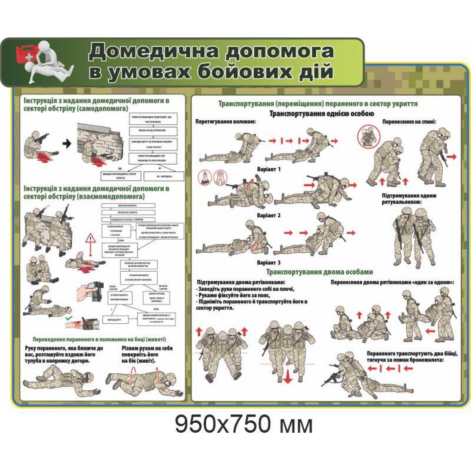 Комплект из 5 информационных стендов «Доврачебная помощь в условиях боевых действий» (размер каждого: 950х750 мм). Стенды изготовлены из прочного пластика или ДВП, подходят для использования в учебных центрах, воинских частях, учреждениях гражданской обороны. Содержат наглядную информацию по оказанию первой помощи, эвакуации раненых, остановке кровотечений, действиям при ранениях, ожогах, травмах и сердечно-легочной реанимации. Яркие иллюстрации и понятные инструкции. Подходят для обучения военных, волонтеров, медиков и спасателей