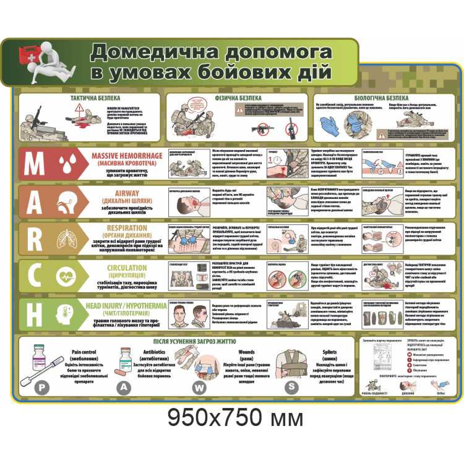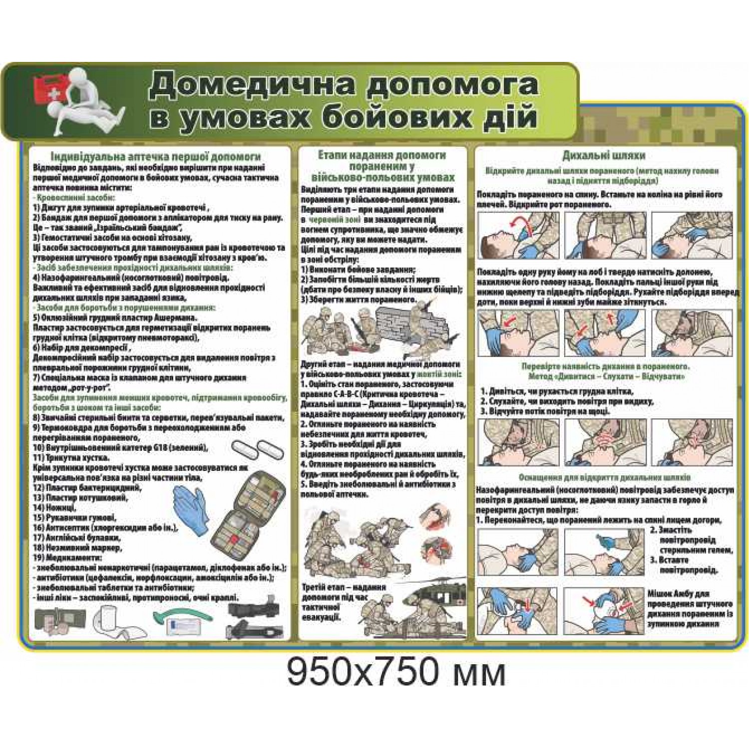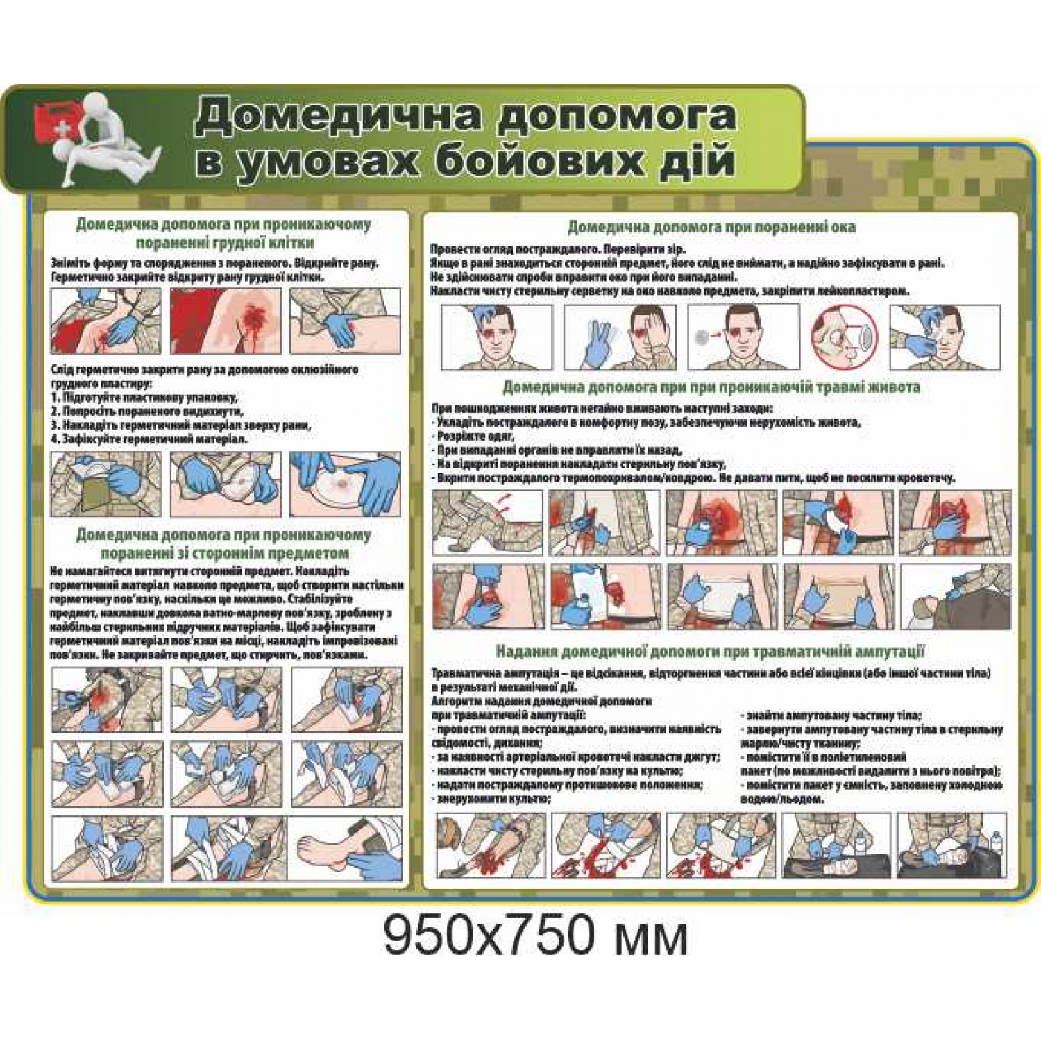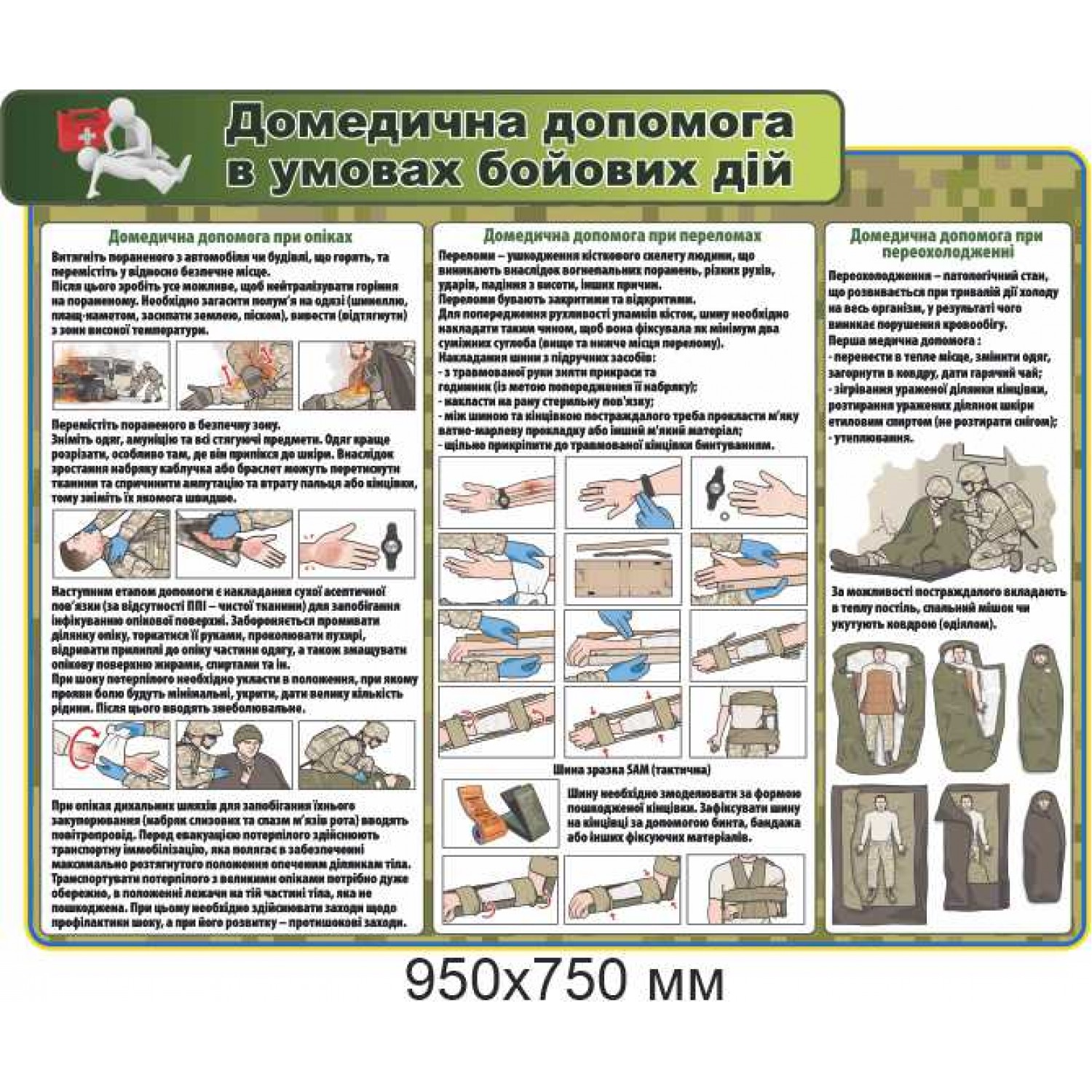 Комплект из 5 информационных стендов «Доврачебная помощь в условиях боевых действий» (размер каждого: 950х750 мм). Стенды изготовлены из прочного пластика или ДВП, подходят для использования в учебных центрах, воинских частях, учреждениях гражданской обороны. Содержат наглядную информацию по оказанию первой помощи, эвакуации раненых, остановке кровотечений, действиям при ранениях, ожогах, травмах и сердечно-легочной реанимации. Яркие иллюстрации и понятные инструкции. Подходят для обучения военных, волонтеров, медиков и спасателей
