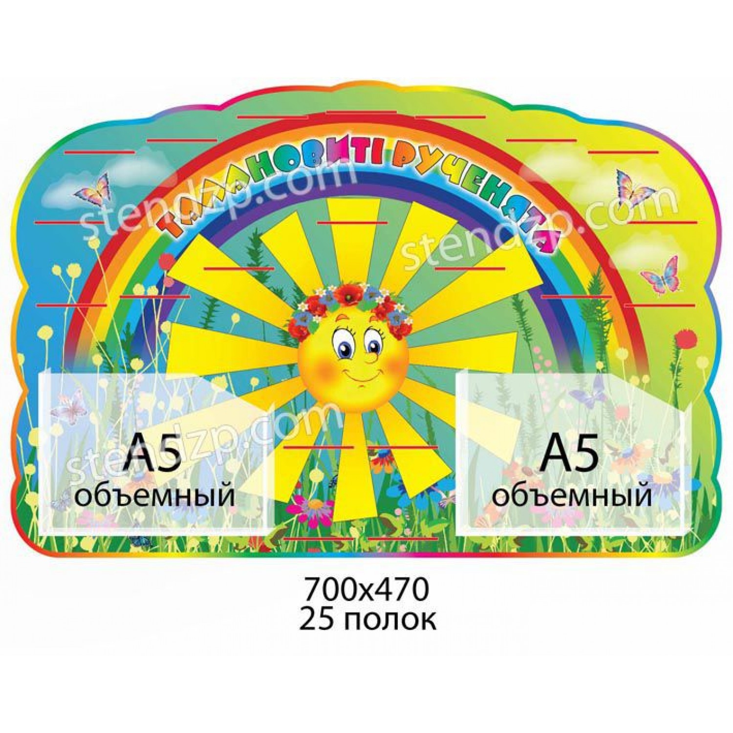 Стенд для лепки "Солнышко" . каждая полка оборудована карманчиком под фамилию ребенка и двумя объемными карманами А-5 формата для рисунков.