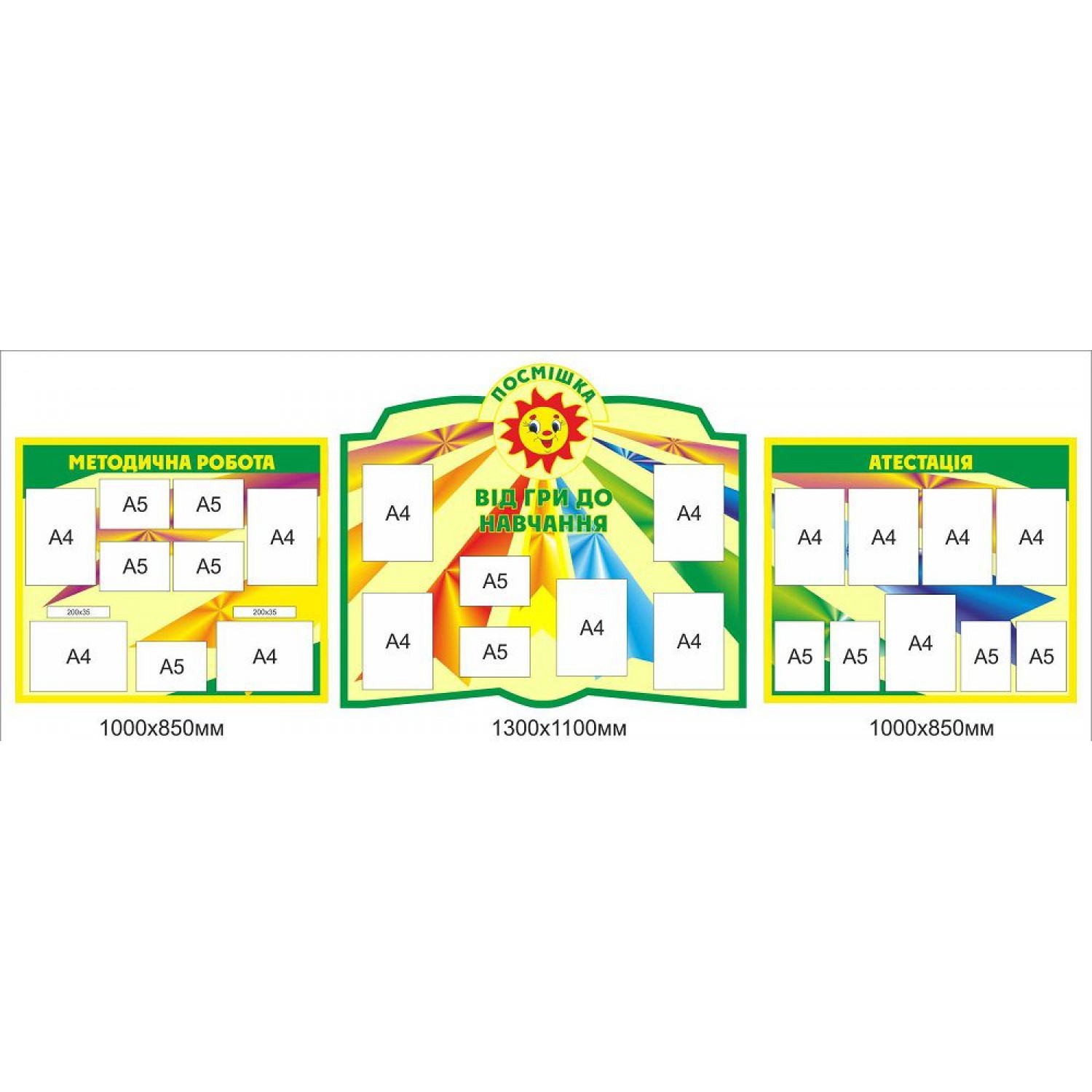 Центральный стенд: ширина 1300 мм, высота 1100 мм; боковые стенды 2шт. : ширина 1000 мм, высота 850 мм