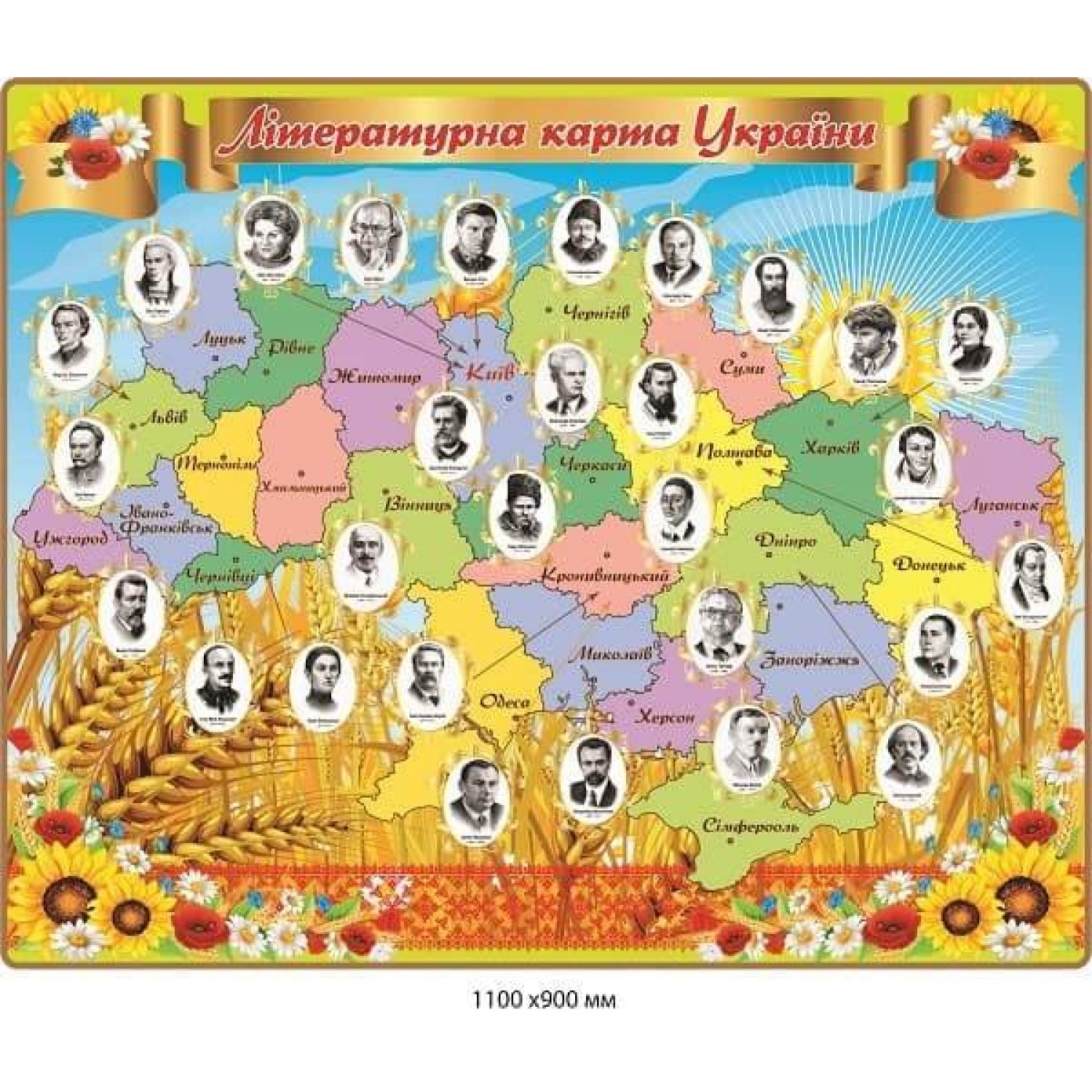 Цветная Литературная карта Украины с портретами писателей (орнамент, цветы)