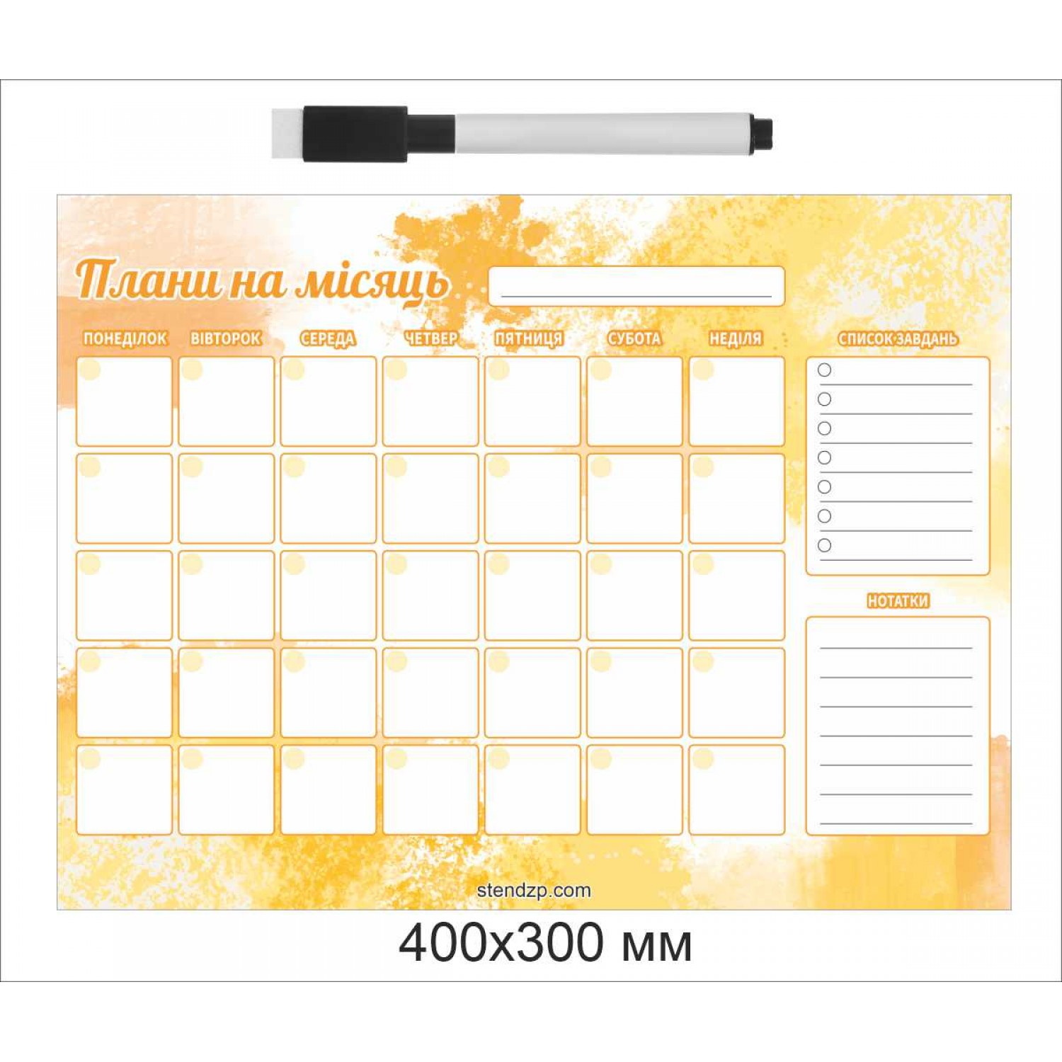 Магнитный планер «Планы на месяц» от компании Стенд Дизайн Украина — это удобный и современный инструмент для организации времени. Размер 400×300 мм, легко крепится к холодильнику или металлической поверхности. Поверхность многоразовая — надписи можно стирать сухим маркером без следов. Планер включает календарь на 5 недель, поле для заметок и список задач. Яркий оранжевый дизайн заряжает энергией и вдохновляет на действие. В комплекте — маркер со стирателем. На сайте stendzp.com вы также можете купить стенды для организаций, школ и офисов.