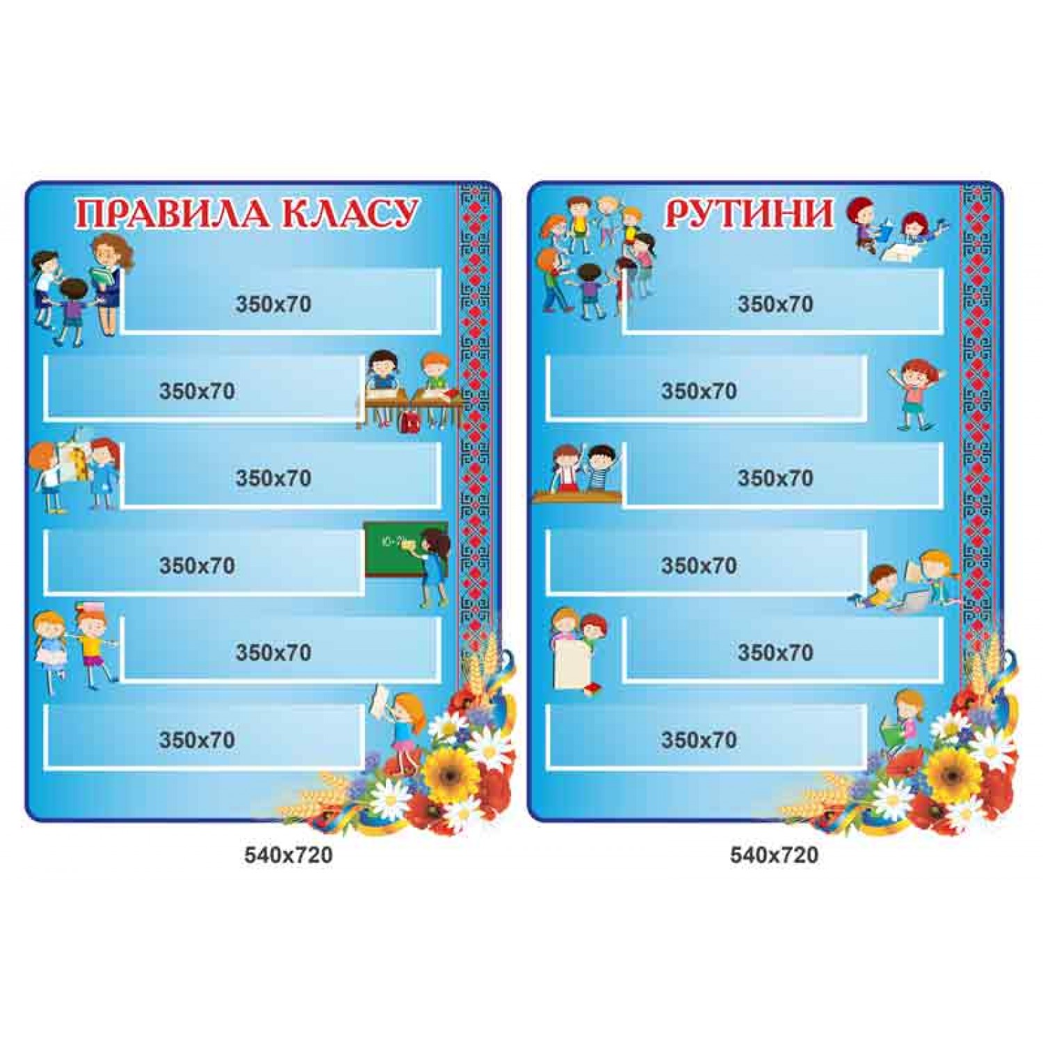 Стенд "Классный уголок" сине-желтый (гос.символы, наши правила, карманы для информации и фото)