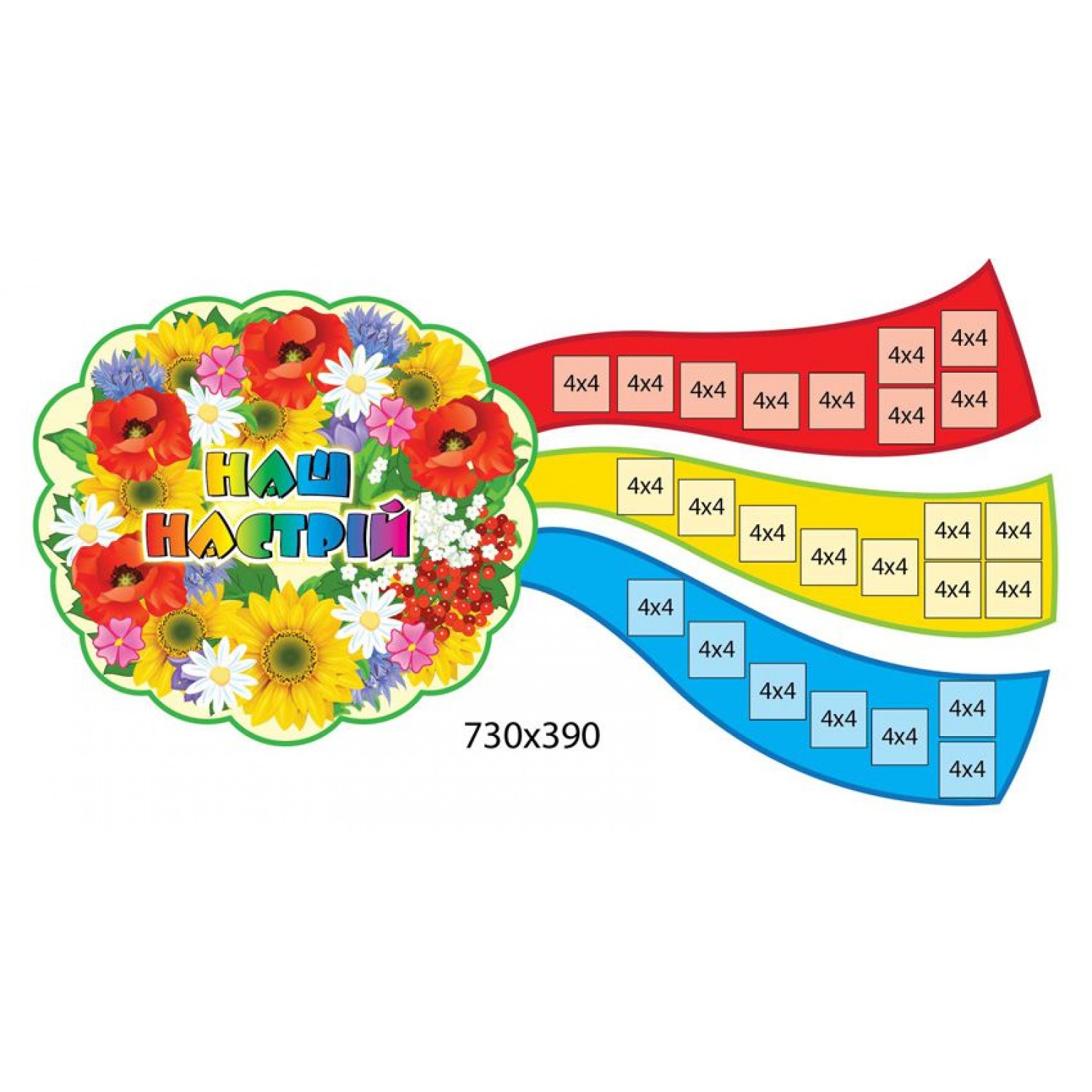 На лентах веночка с помощью монтажной ленты прикреплены самоклеющиеся кармашки форматом 4х4. При необходимости вы можете увеличить количество пластиковых карманов, изменить заголовки, цветовую гамму и размеры и даже заказать наглядные пособия по собственному макету.