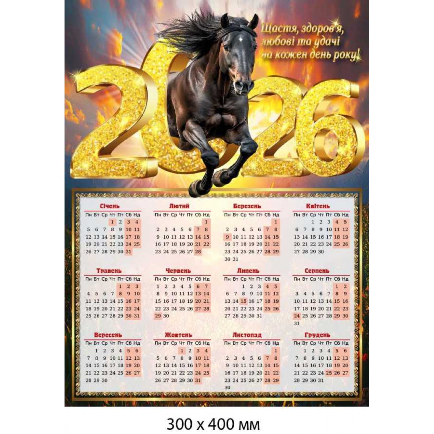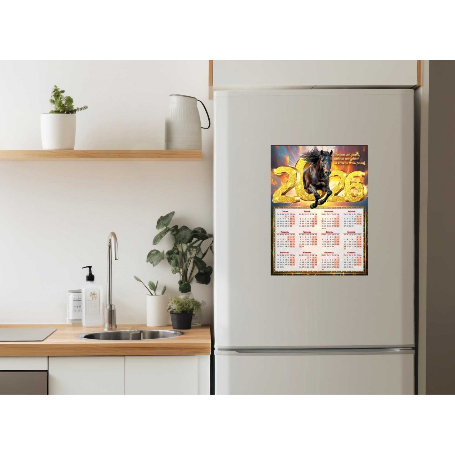 Магнитный календарь на 2026 год с изображением мощного чёрного коня — это стильное и практичное решение для дома, офиса или учебного пространства. Календарь выполнен в формате 300×400 мм, оформлен в эффектном золотом дизайне с пожеланием «Счастья, здоровья, любви и удачи на каждый день года!» Благодаря магнитной основе он легко крепится на холодильник или любую металлическую поверхность. Красивый и функциональный аксессуар, который создаёт позитивное настроение на весь 2026 год