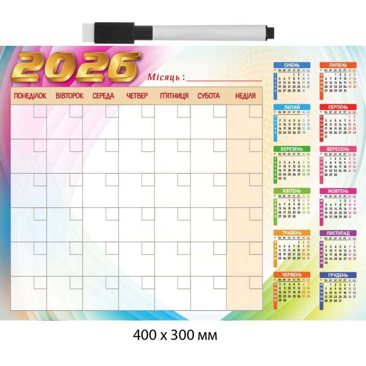 Настенный магнитный планер «Месяц 2026» разработан для детального планирования на месяц. Поле разделено на ячейки для удобного внесения заметок и задач. Встроенный годовой календарь 2026 года упрощает контроль дат и сроков. Подходит для офисов, школ, медицинских учреждений и домашнего использования. Прочная поверхность рассчитана на многократное стирание