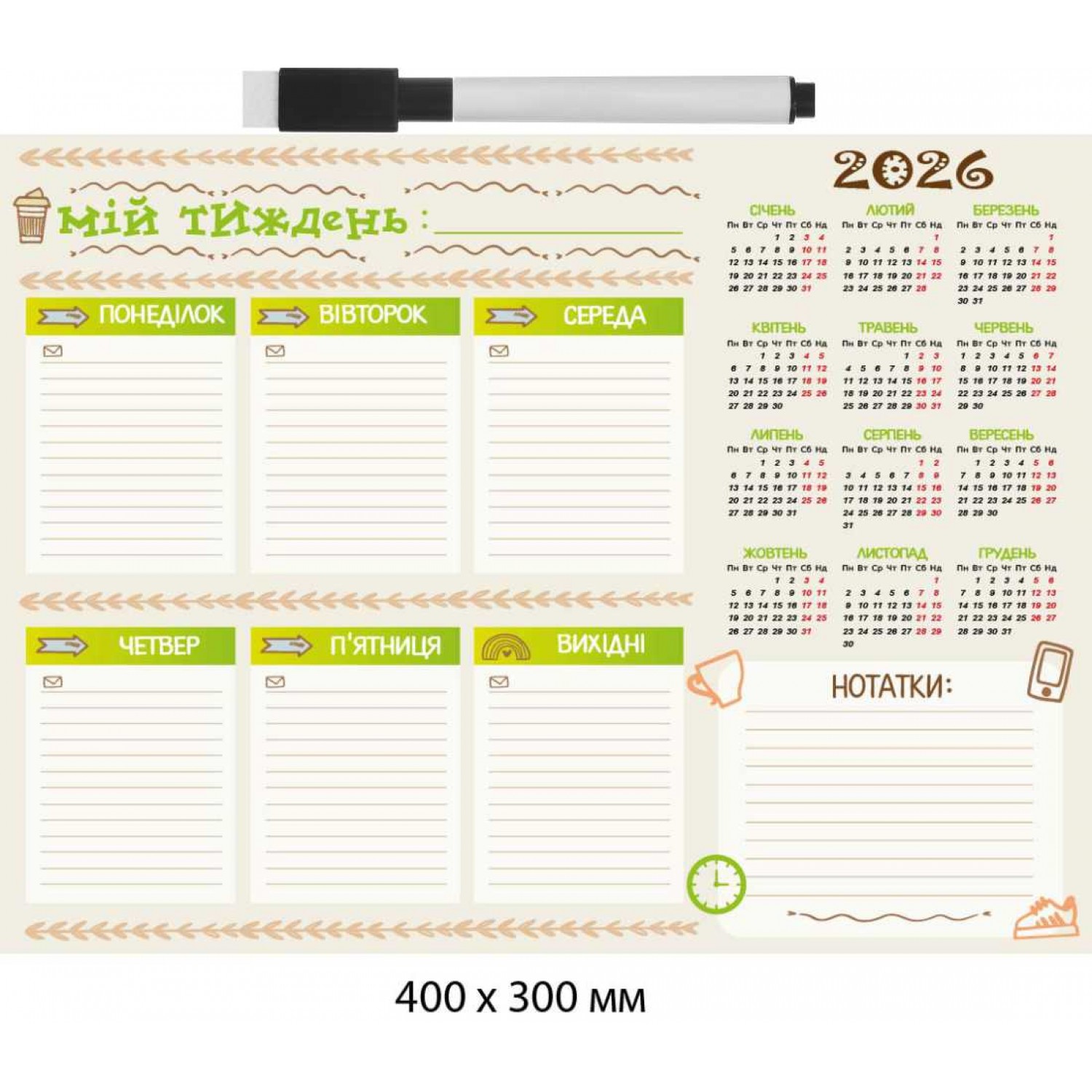Настенный магнитный планер «Мій тиждень» на 2026 год выполнен в спокойном эко-дизайне. Формат 400×300 мм позволяет удобно распределять задачи на каждый день недели и вести заметки. Поверхность предназначена для многократного письма и стирания без следов. Подходит для семьи, офиса и учебных заведений. В комплекте идет маркер с губкой, что делает использование максимально удобным