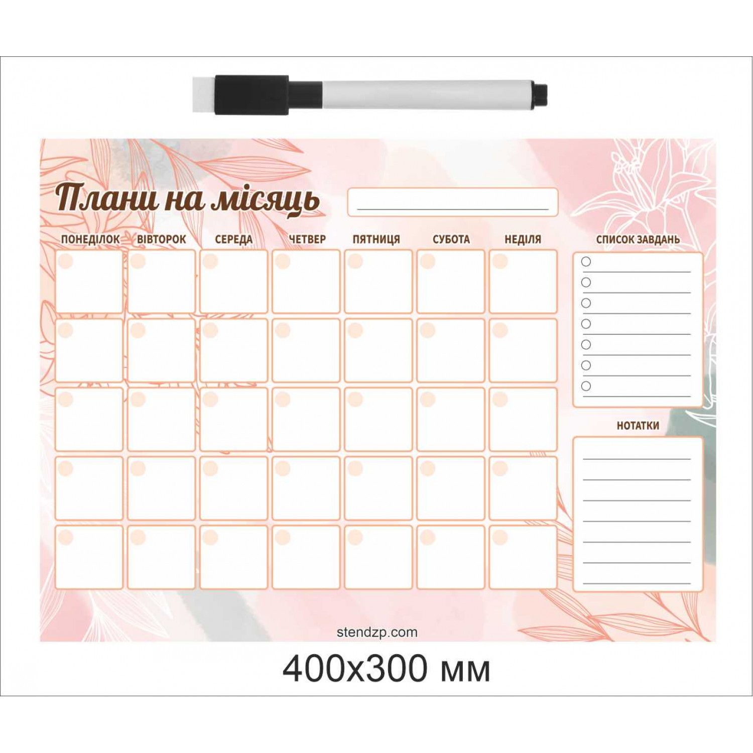Магнитный планер «Планы на месяц» от компании Стенд Дизайн Украина — стильный и удобный инструмент для планирования дел. Размер изделия 400×300 мм, легко крепится на холодильник или любую металлическую поверхность. Поверхность многоразовая — записи можно стирать сухим маркером без следов. Планер содержит календарную сетку на 5 недель, блок для заметок и список задач. Нежный пастельный дизайн с цветочными элементами создаёт ощущение уюта и гармонии. В комплект входит маркер со стирателем. Отличный выбор для дома, офиса или учебы