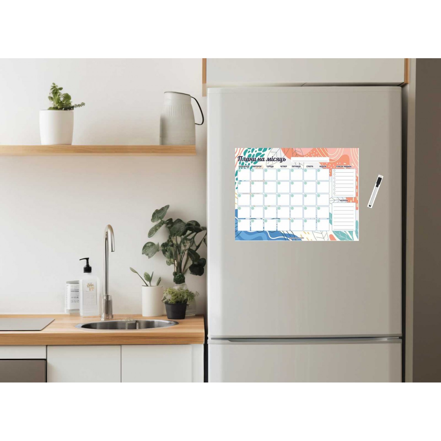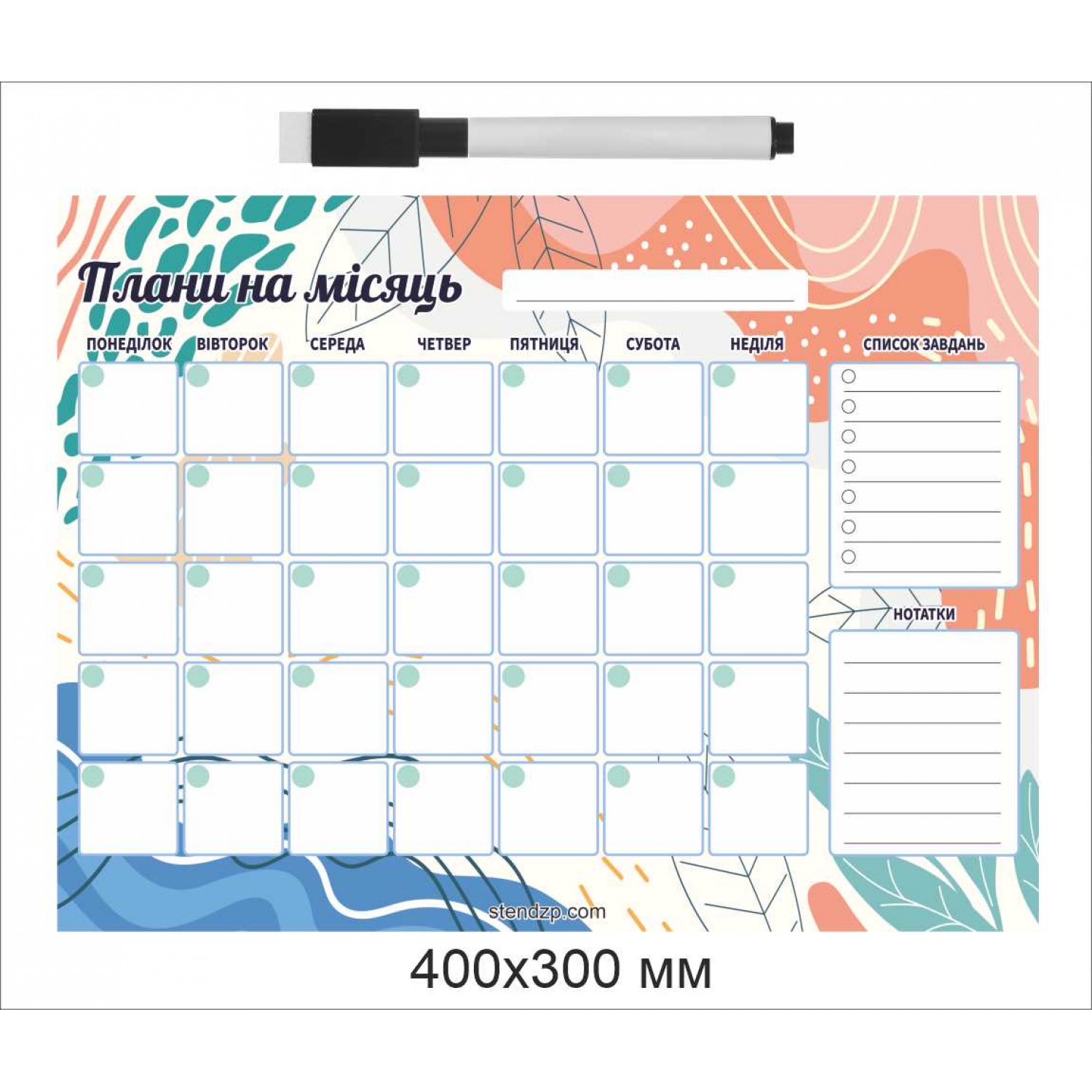Магнитный планер «Планы на месяц» от компании Стенд Дизайн Украина — удобный и современный инструмент для организации времени. Размер 400×300 мм, подходит для размещения на холодильнике или любой металлической поверхности. Поверхность многоразовая — записи стираются сухим маркером без следов. Планер включает календарь на 5 недель, раздел «Список заданий» и блок для заметок. Современный дизайн с природными элементами добавляет уюта и вдохновения. В комплект входит маркер со стирателем. Отличный выбор для дома, офиса или в подарок