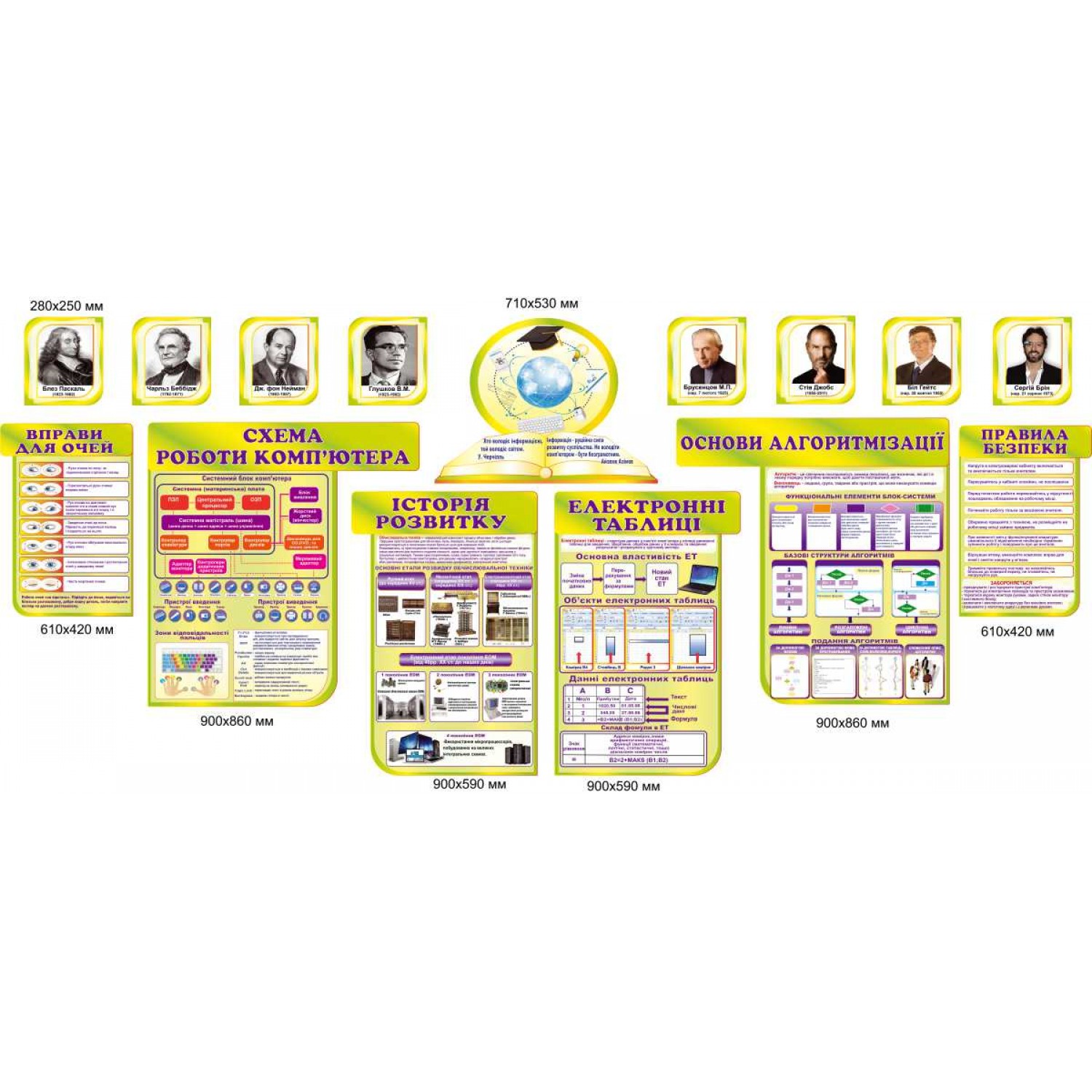 - Набор стендов для оформления кабинета информатики (История, Схемы работы компьютера, Правила безопасности ..) салатовый фон