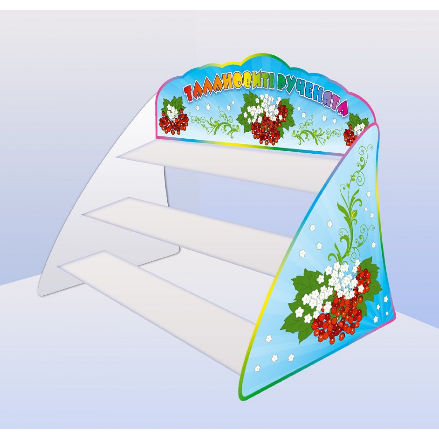 Эта конструкция состоит из боковых вертикальных деталей в виде треугольников с закругленными углами (280х320 мм), части-заголовка с названием (500х170 мм) и трех полочек (500х80 мм).