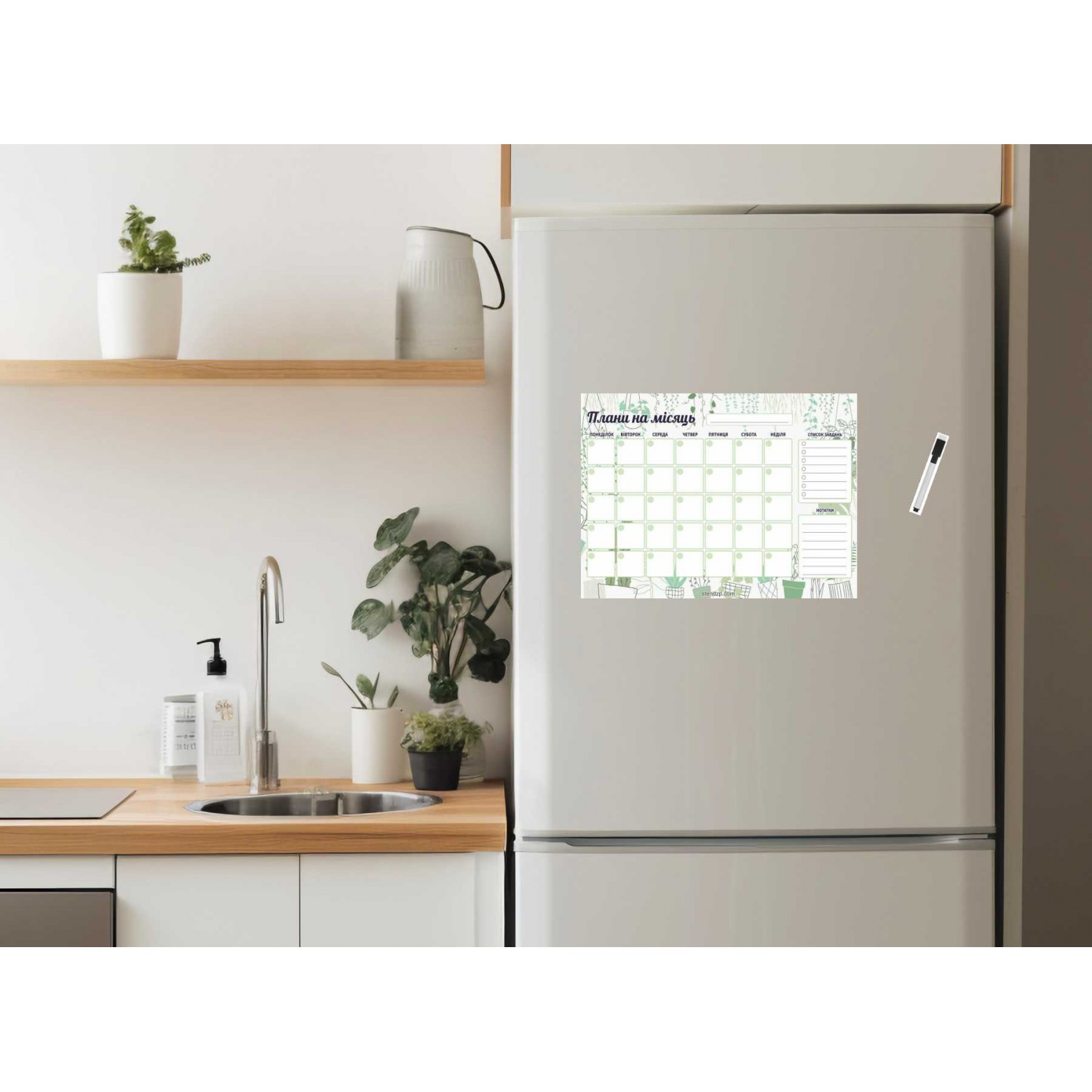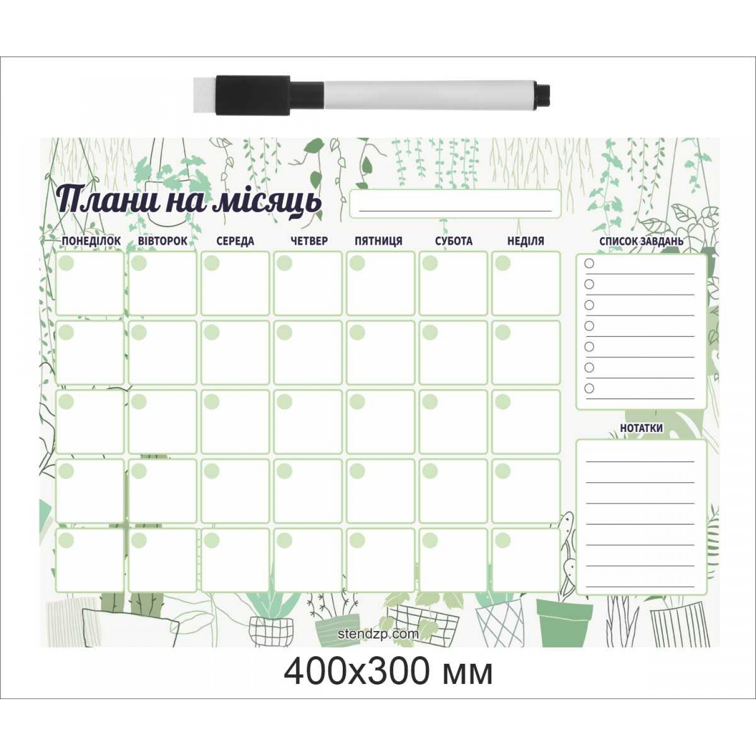Магнитный планер «Планы на месяц» от компании Стенд Дизайн Украина — удобный и стильный помощник для организации дел и задач. Размер 400×300 мм, легко крепится на холодильник или другую металлическую поверхность. Поверхность многоразовая — записи стираются сухим маркером без следов. Планер включает календарную сетку на 5 недель, блок для заметок и список заданий. Спокойный зелёный дизайн с растительными элементами создаёт ощущение свежести и уюта. В комплект входит маркер со стирателем. Отличный выбор для дома, офиса или в подарок