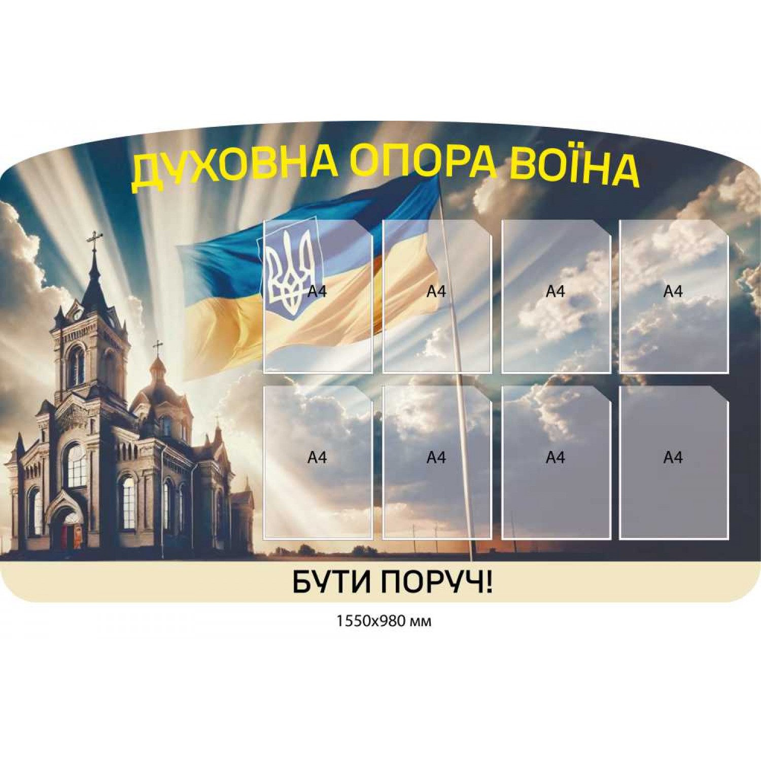Этот уникальный информационный стенд разработан как центральный элемент для учреждений, школ, общественных организаций, воинских частей или культурных центров. В его основе – мощный визуальный ряд: величественный православный собор, как символ духовной стойкости, и гордо развевающийся Государственный Флаг Украины, олицетворяющий суверенитет и несокрушимость. В центре композиции – герб Украины, утверждающий национальную идентичность.