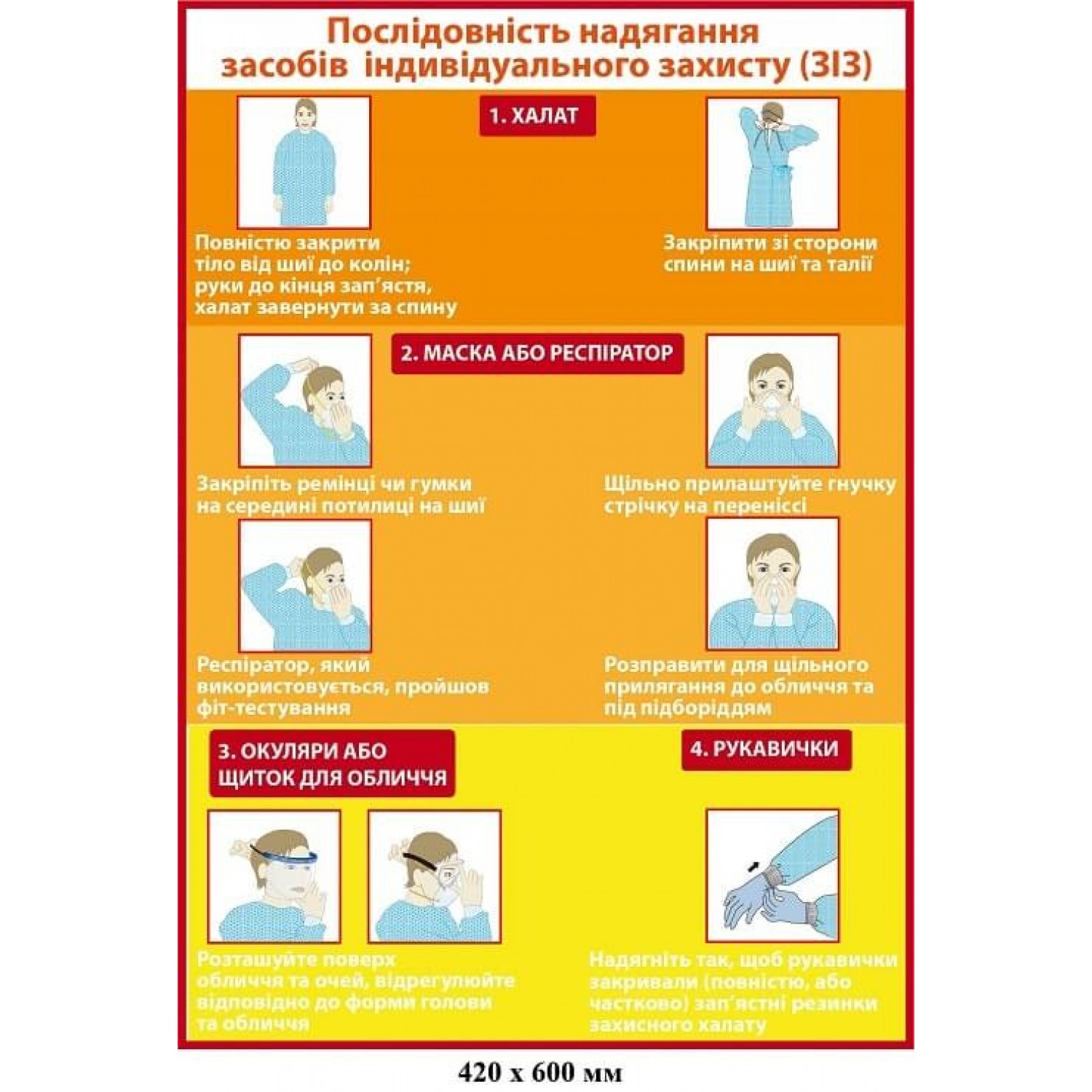 - Плакат "Последовательность надевания средств индивидуальной защиты (СИЗ)" (оранжевый фон)