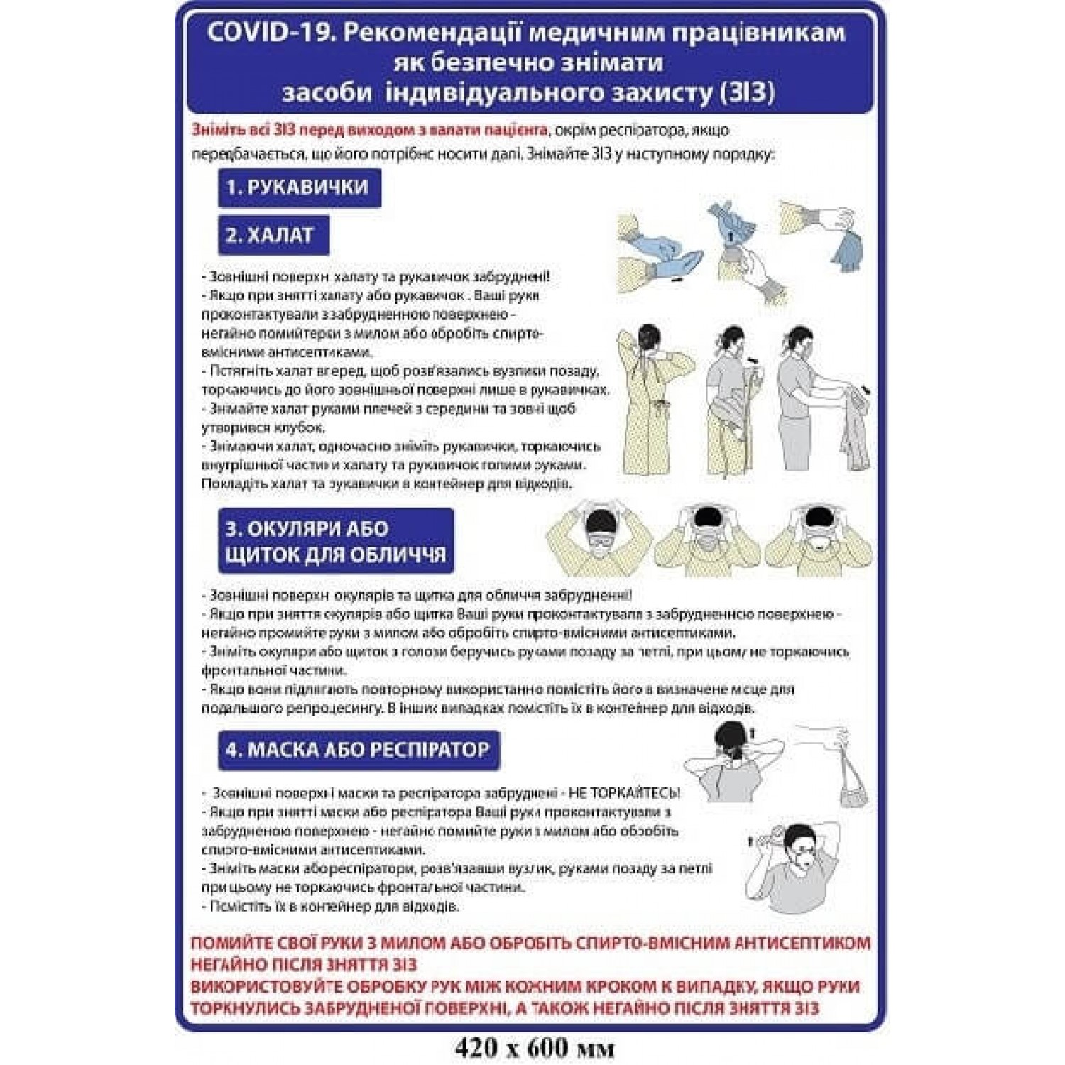 - Плакат Рекомендации по безопасному снятию средств индивидуальной защиты (синий)