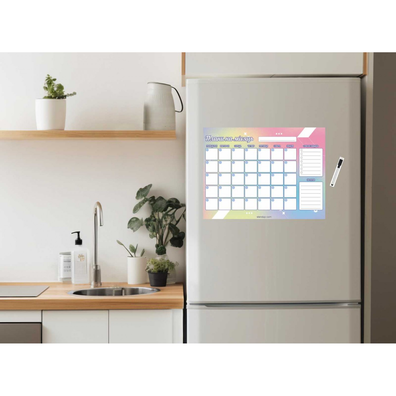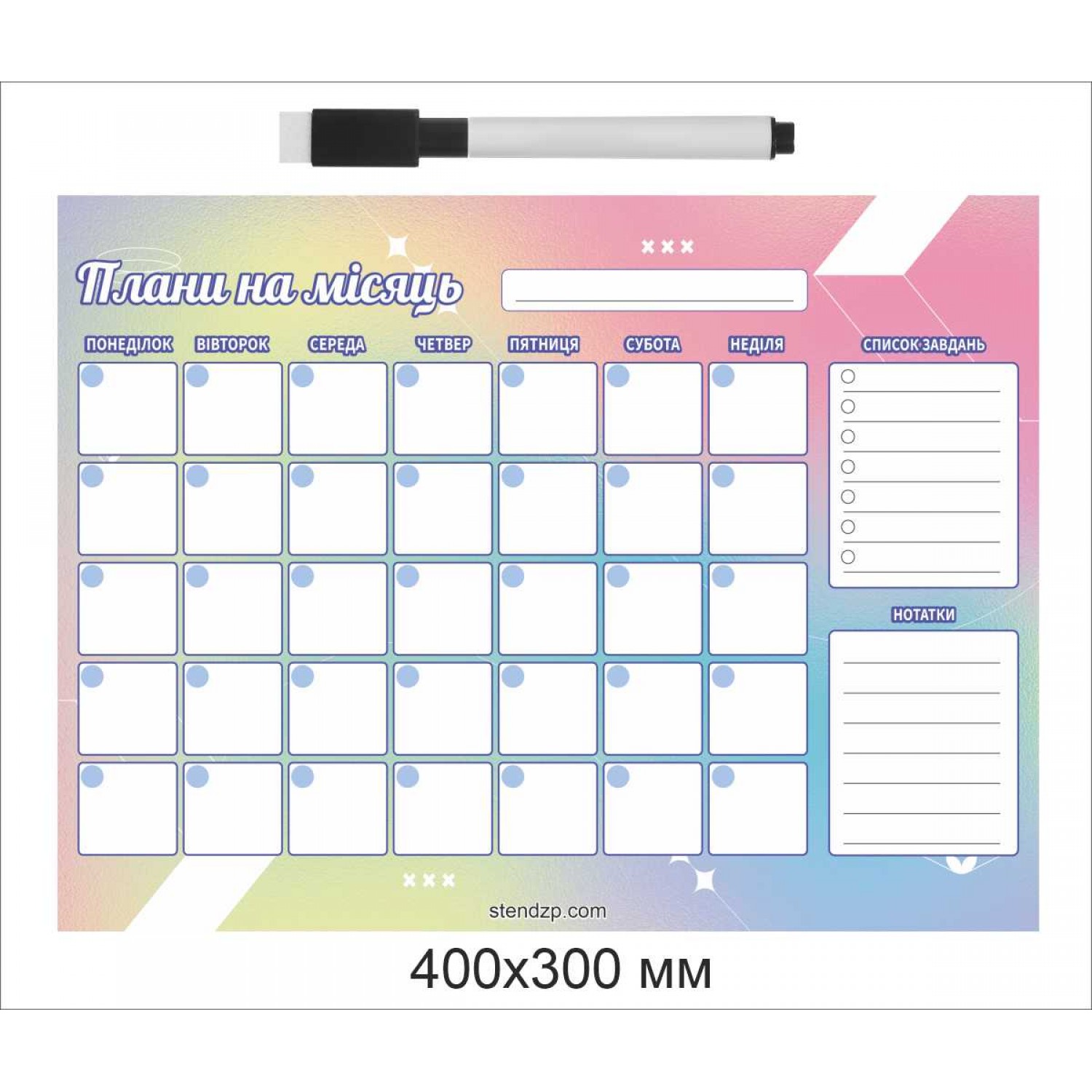 Магнитный планер «Планы на месяц» от компании Стенд Дизайн Украина — стильный и практичный помощник для планирования. Размер 400×300 мм, легко крепится к холодильнику или любой металлической поверхности. Поверхность многоразовая — записи стираются сухим маркером без следов. Планер включает календарную сетку на 5 недель, раздел «Список заданий» и блок для заметок. Нежный пастельный градиентный дизайн создаёт ощущение лёгкости и вдохновения. В комплекте — маркер со стирателем. Идеальное решение для дома, офиса или в подарок — всё под контролем и на виду.