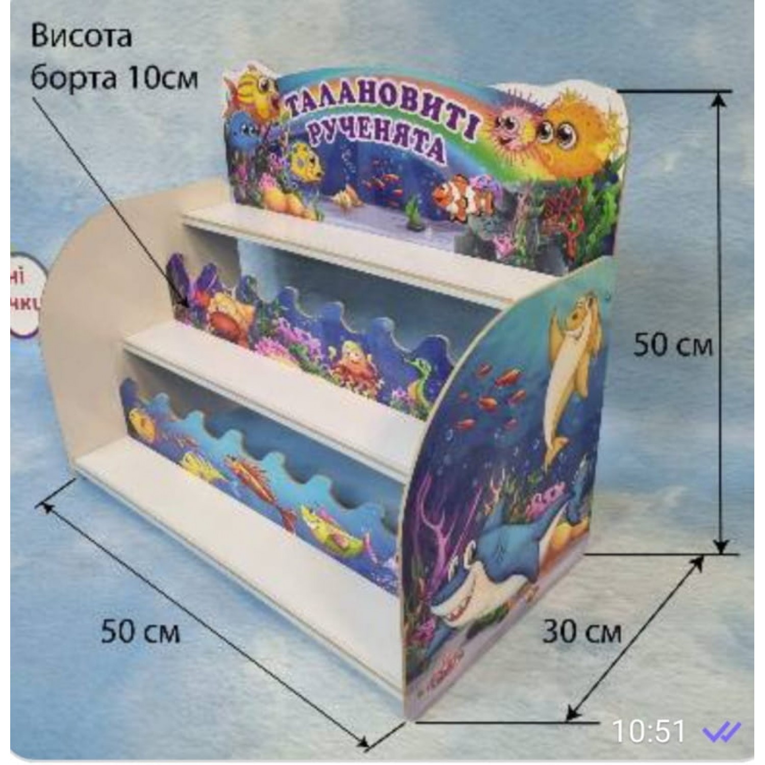 Для таких подставок для творческих работ воспитанников детского сада характерно тематическое оформление. Эта позиция товара фирмы "Стенд-дизайн" отличается морской тематикой: волны, яркие рыбки, водоросли и кораллы. Их дополняет радуга как фон для фиолетового названия «Талантливые ручки». Фоном служит темно- и светло-синий цвет морских глубин и белые полки для размещения работ.