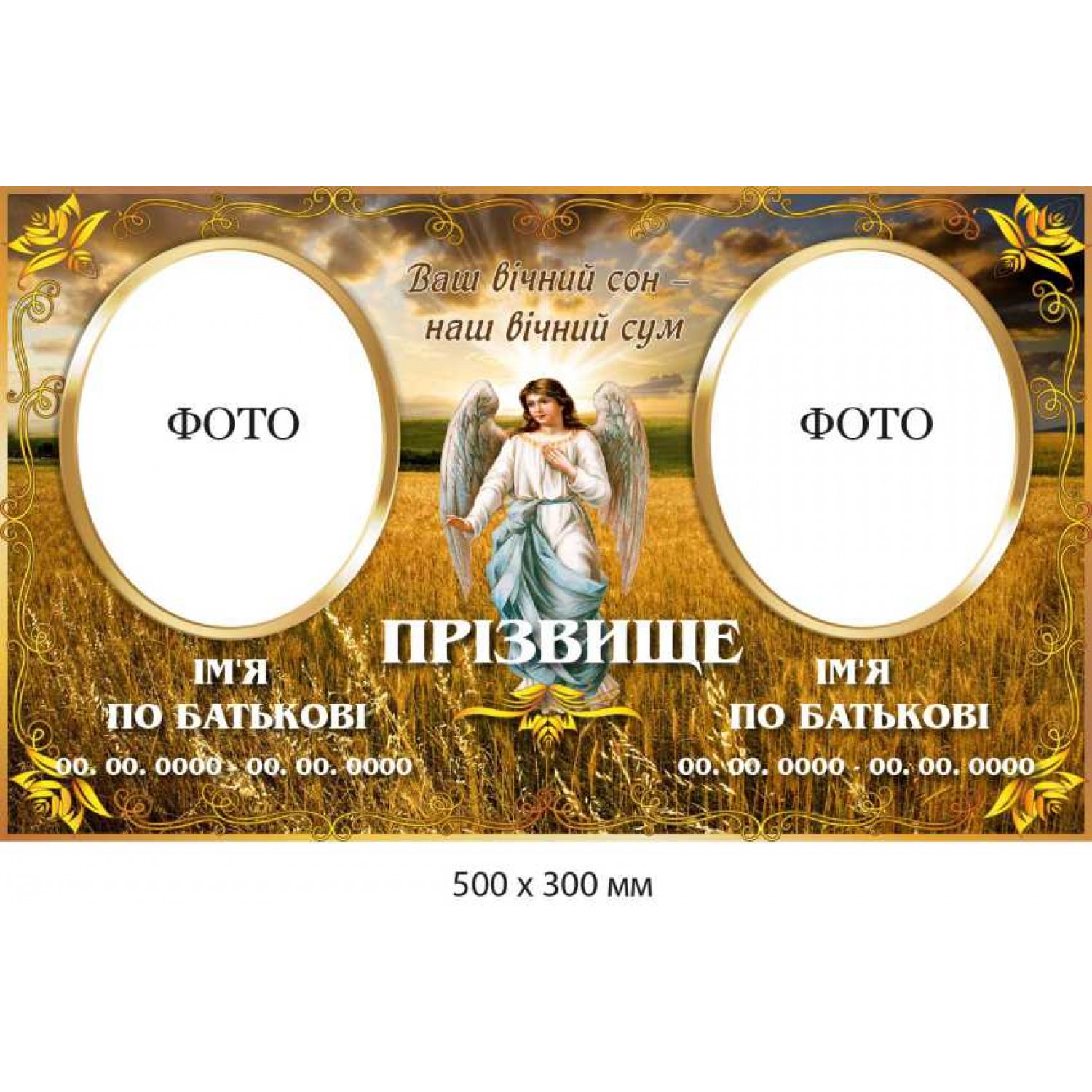 - Ритуальная табличка на две фотографии с ангелом в поле пшеницы (500х300 мм)