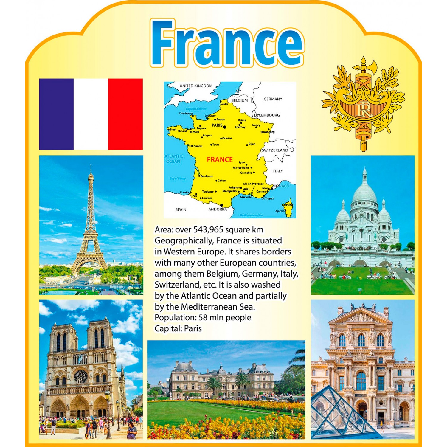 Описание Стенд Карта и объекты архитектуры Франции на английском языке
