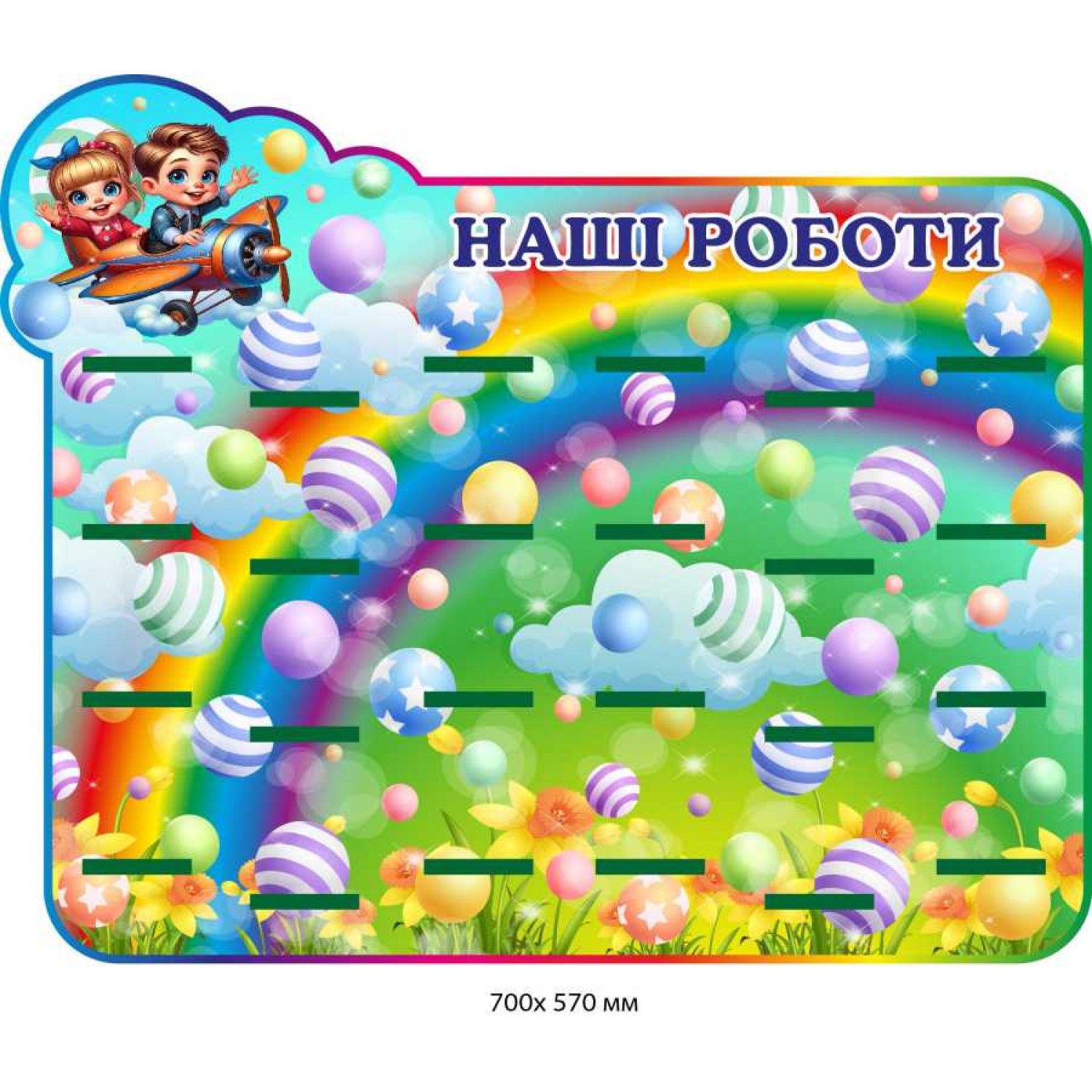 Стенд "Наши работы" с иллюстрацией для рисунков детской группы