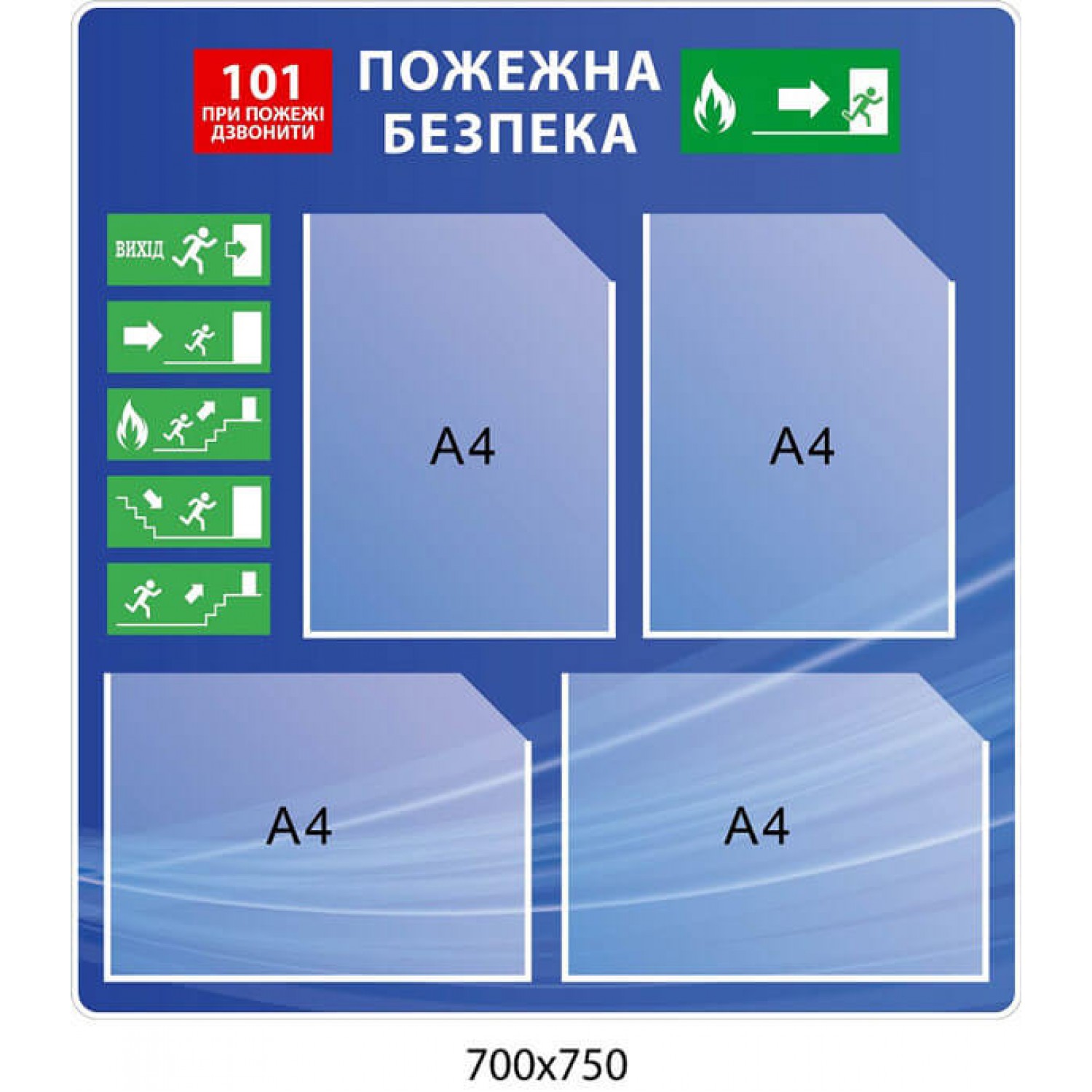 Стенд Пожарная безопасность Эвакуация синий 4 кармана А4