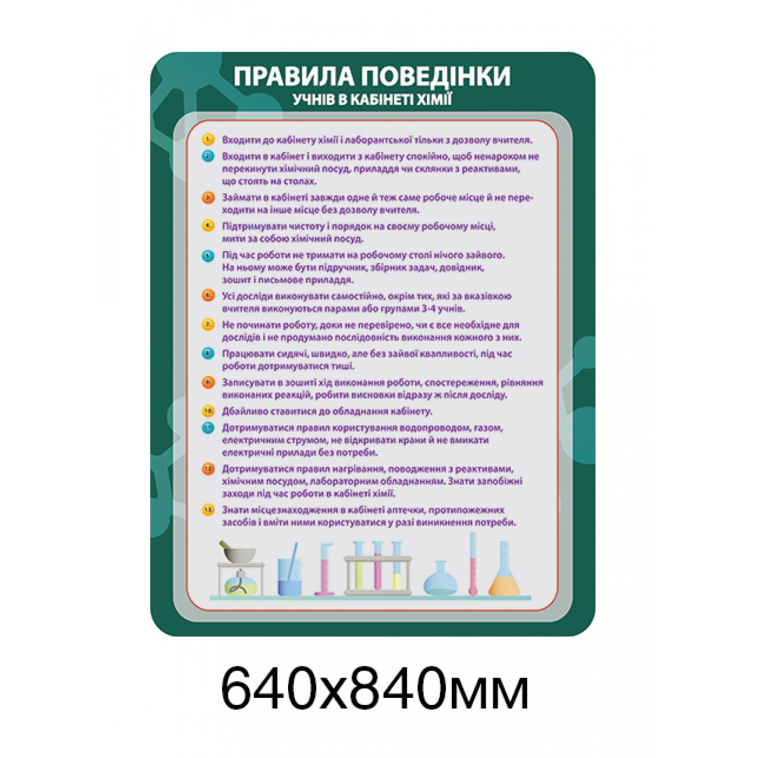 - Стенд Правила поведения учащихся в кабинете химии (тёмно-зелёный фон)