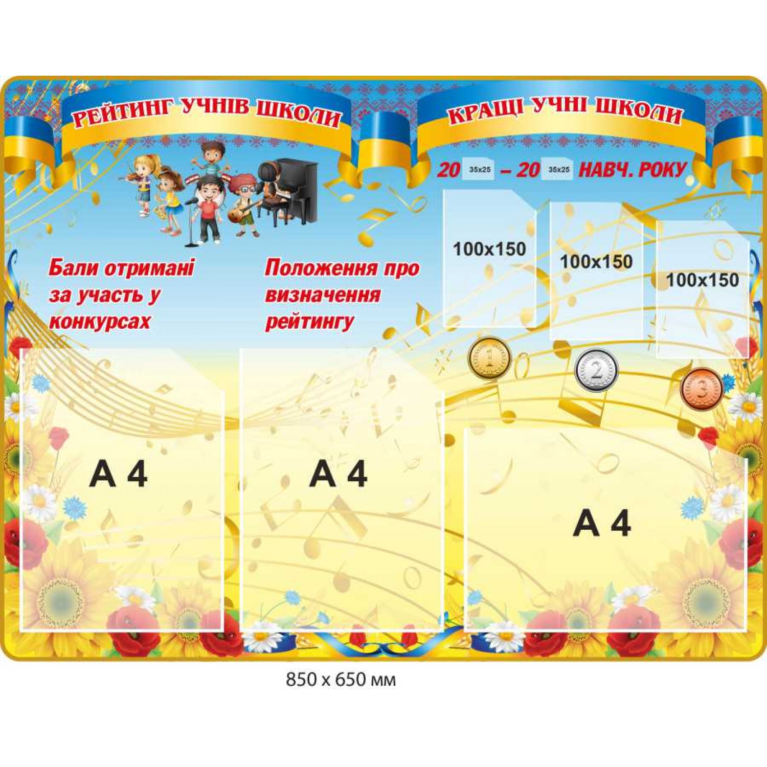 - Стенд "Рейтинг учащихся школы" голубой и желтый с цветами и детьми 850х650 мм, 6 карманов