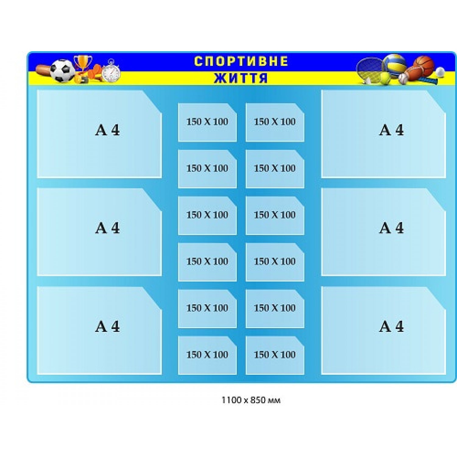 - Стенд "Спортивная жизнь" с карманами (голубой фон, флаг Украины, спорт.инвентарь)