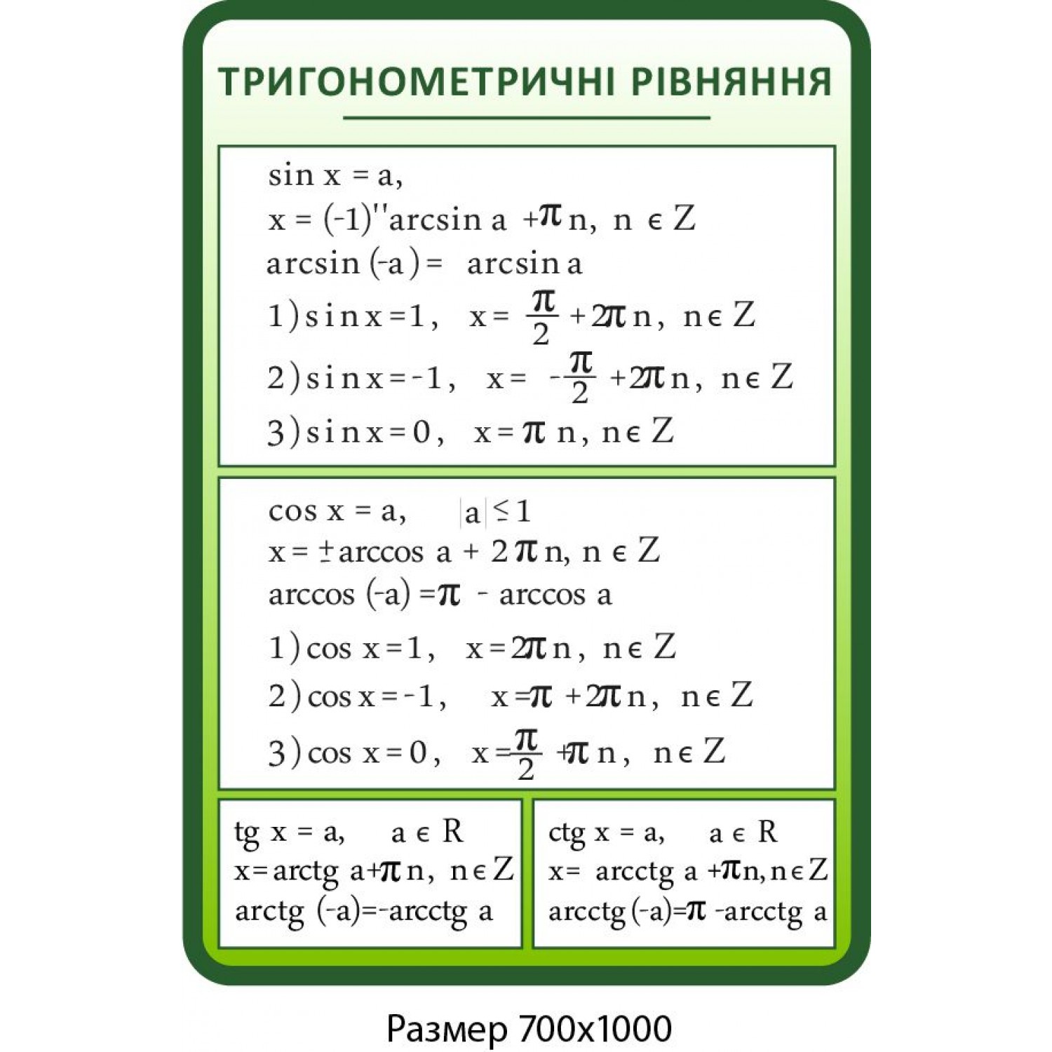 На прямоугольнике (700х1000 мм) на четырех белых блоках размещены, сгруппированные по содержанию, важнейших уравнения из раздела тригонометрии. Они написаны черным цветом. Заголовок – темно-зеленый. Этот цвет, как и светло-зеленый, использован для обрамления белой площади.