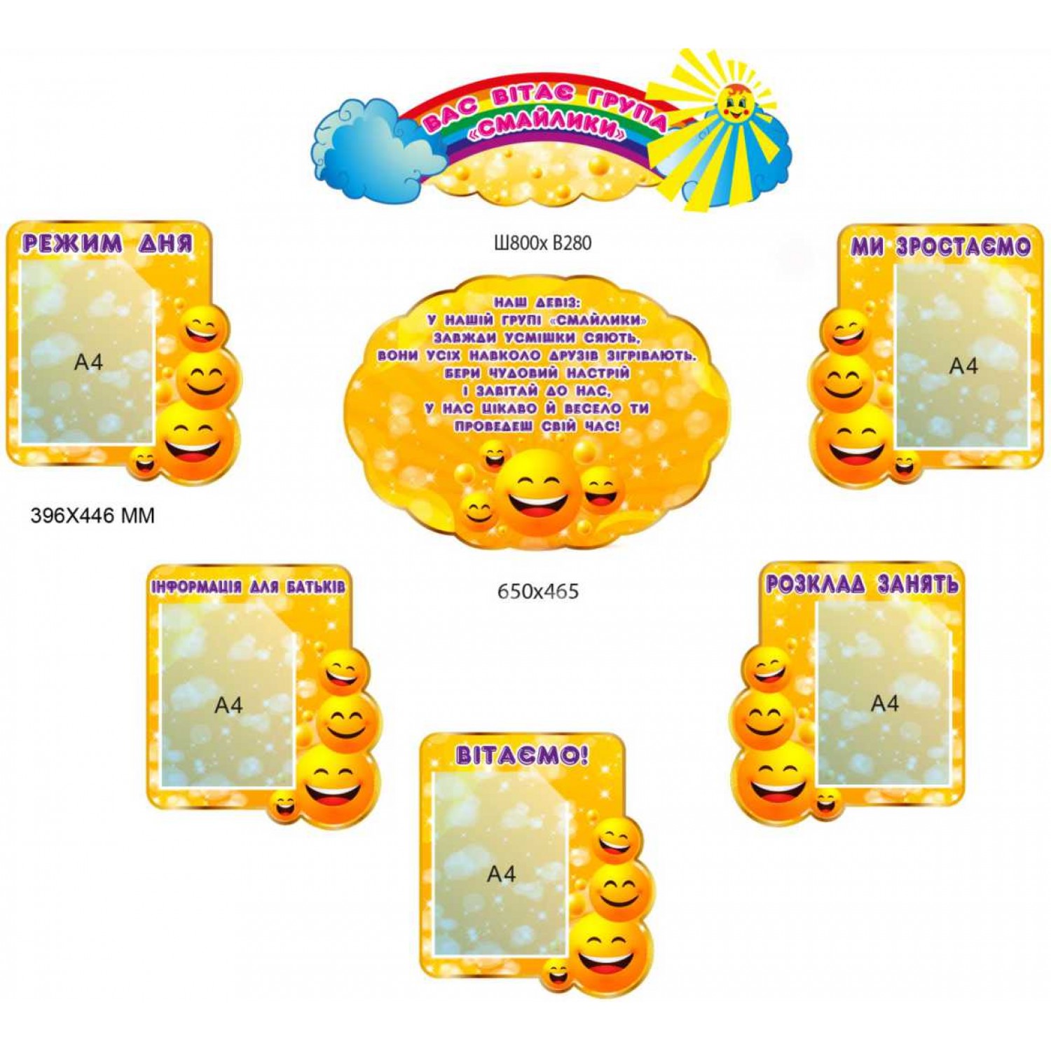 В него вошли заголовок размером 800×280 мм, центральный элемент размером 650×465 мм с девизом группы. А также – 5 инфо-стендов размером 396 × 446 мм каждый, рассчитанные на один прозрачный карман формата А 4. Это – «Режим дня», «Информация для родителей», «Поздравляем», «Мы растем» и «Расписание занятий».