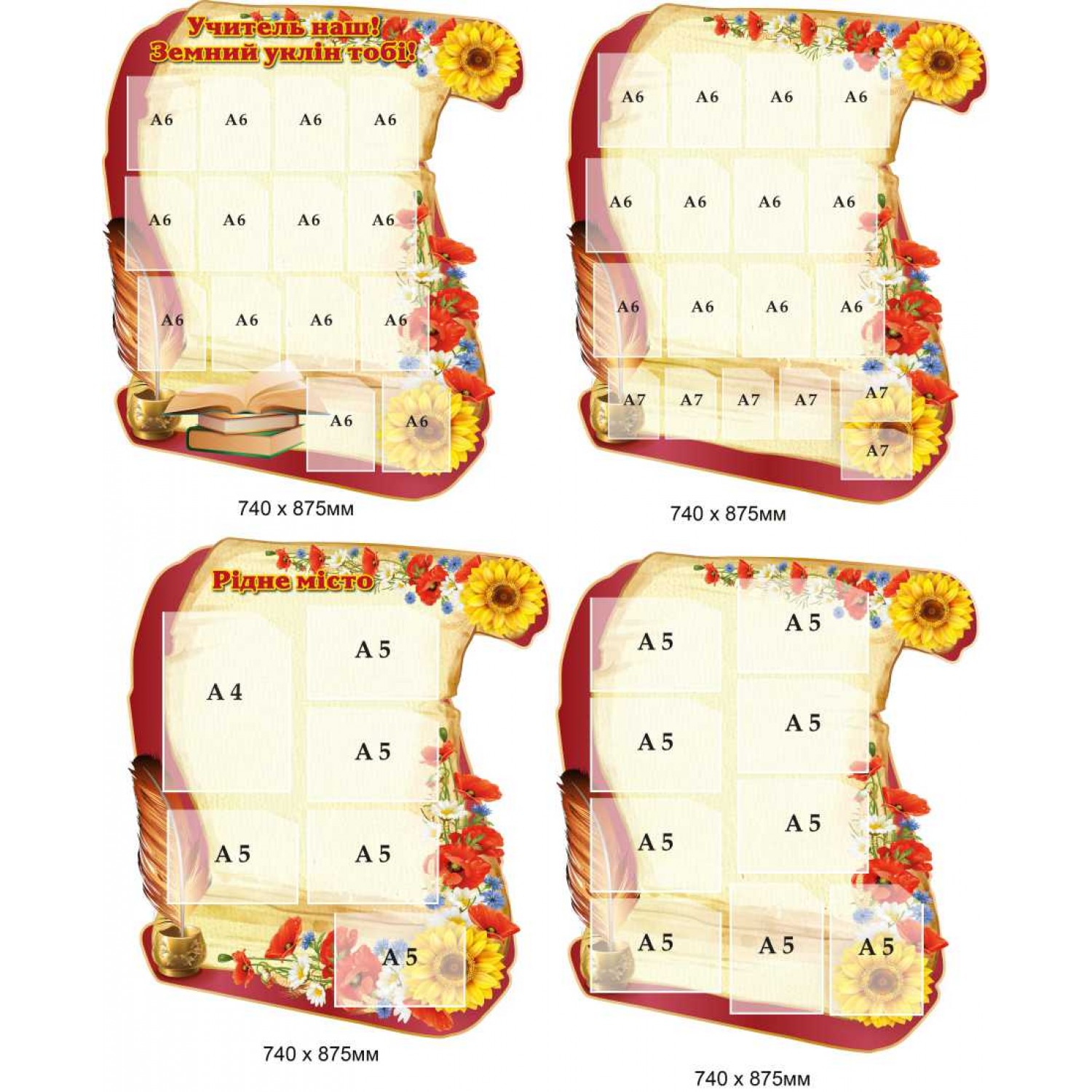 - Стенды-визитки для школы 4 штуки по 740×875 мм с прозрачными карманами