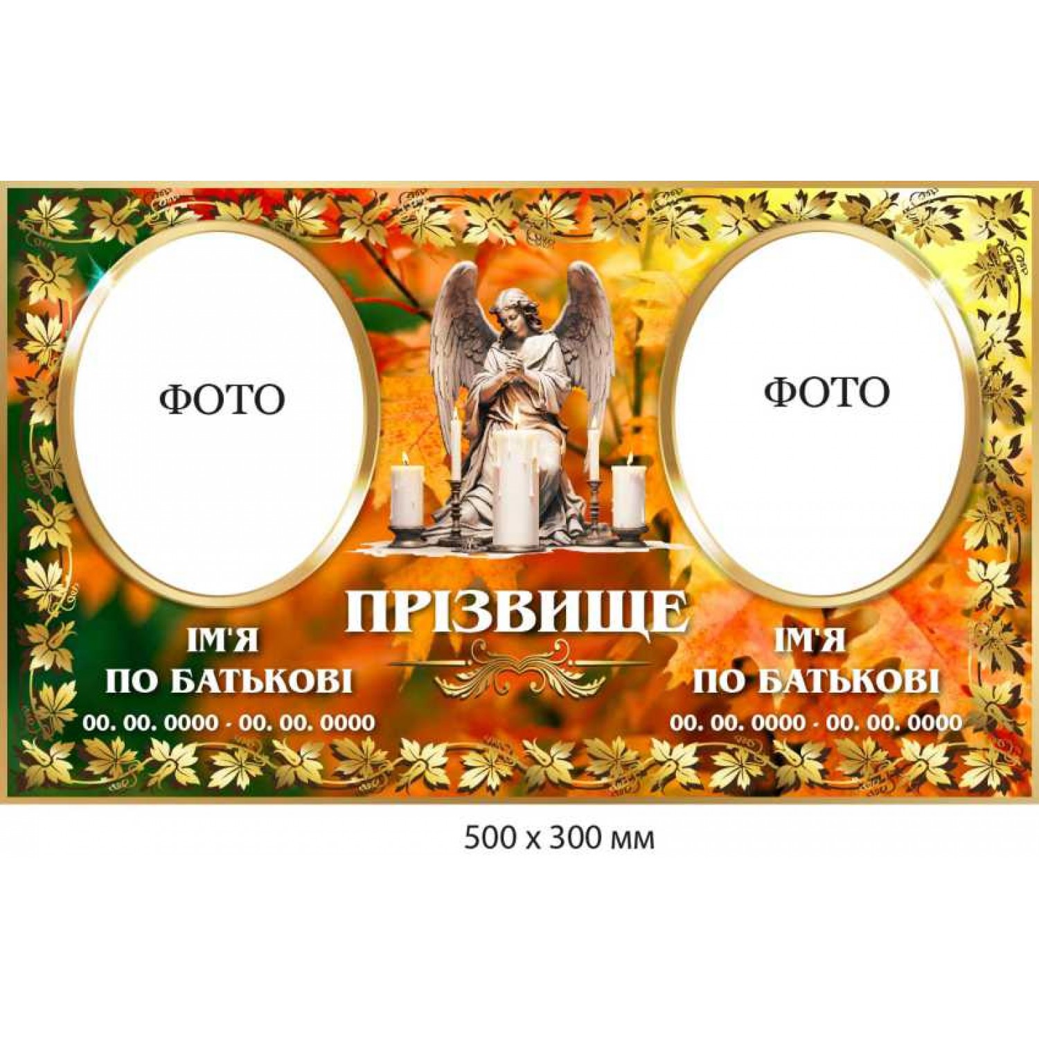 На прямоугольной основе (500х300 мм) разместили два одинаковых медальона. Для них выбрали овальную форму. Посередине – каменный памятник в виде скорбного ангела. Для подписей выбрали белую краску.