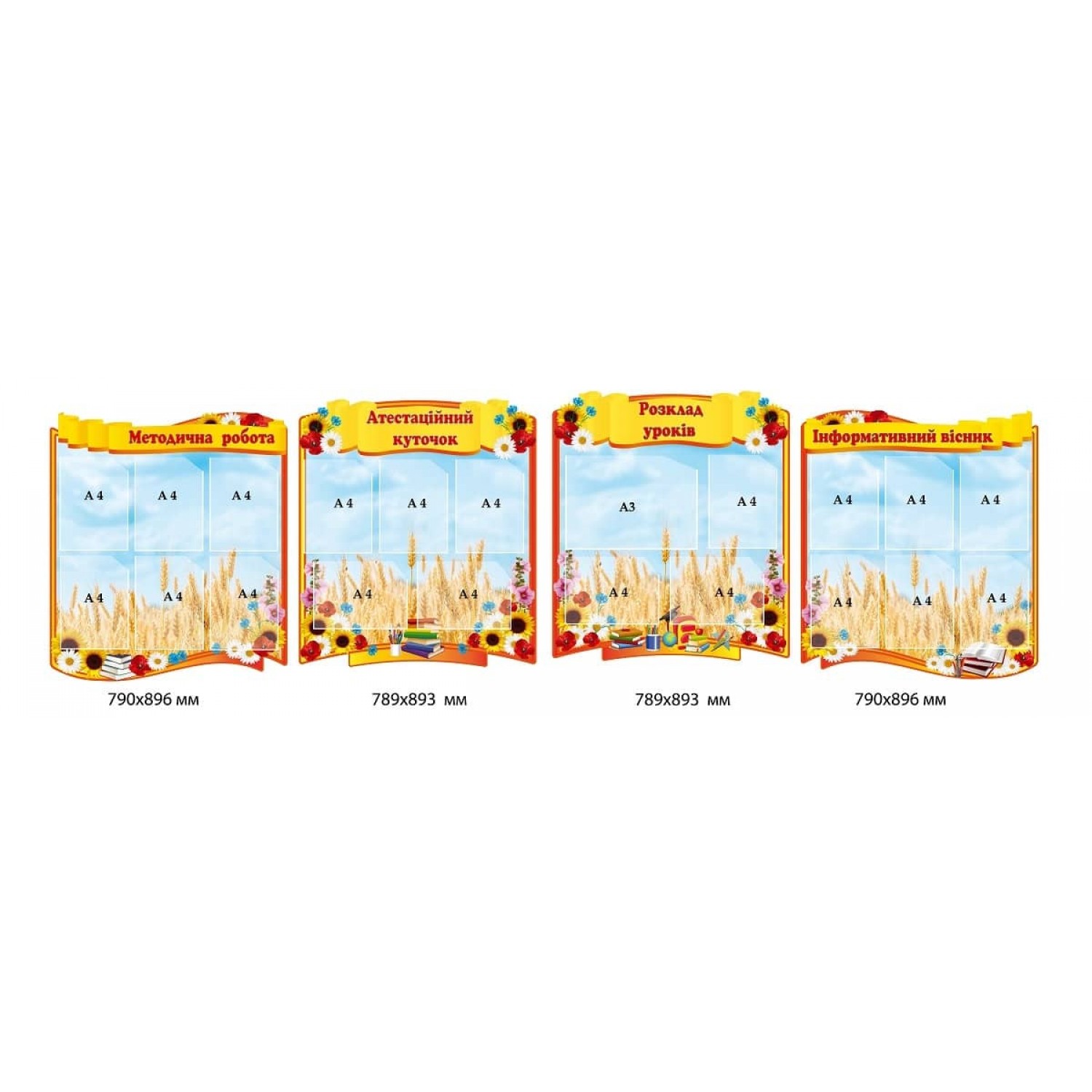 - Набір стендів для візитки школи Розклад уроків, Методична робота, Інф вісник, Атестаційний куточок (небесний фон, квіти і пшениця)