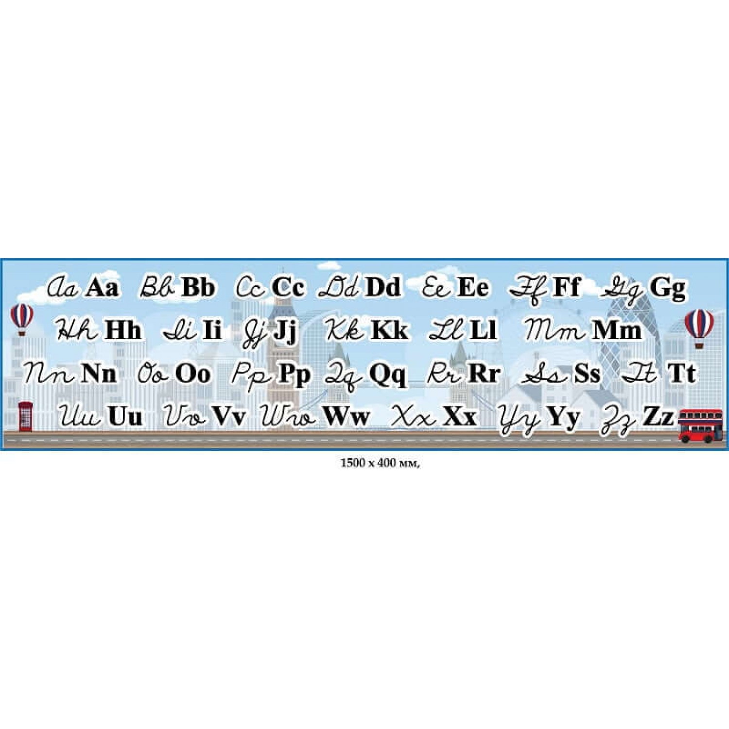 Правопис англійського алфавіту друкованими та прописними літерами на блакитному тлі