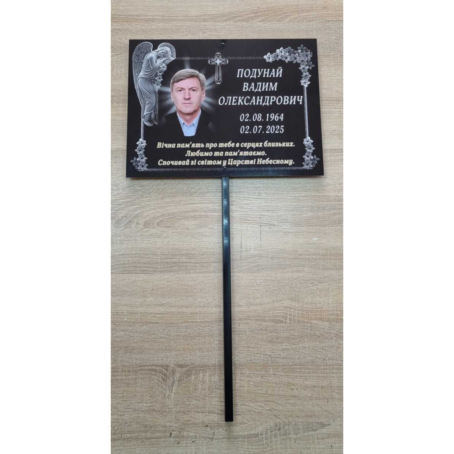 Розмір таблички 400×300 мм дозволяє розмістити всю необхідну інформацію — ПІБ, дати життя, епітафію або індивідуальний напис. Металева ніжка довжиною 700 мм (разом із табличкою) забезпечує надійну установку в ґрунт та стабільність конструкції.