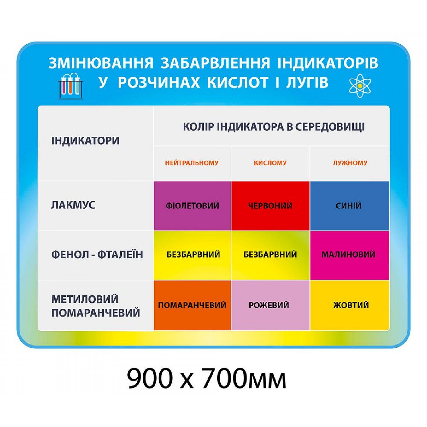 - Стенд Змінювання забарвлення індикаторів у розчинах кислот і лугів (блакитний)