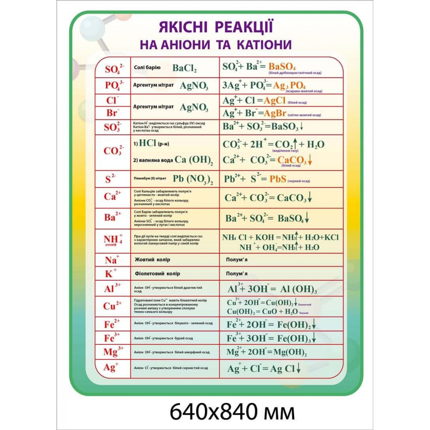- Стенд Якісні реакції на аніони та катіони (жовто-зелений фон)