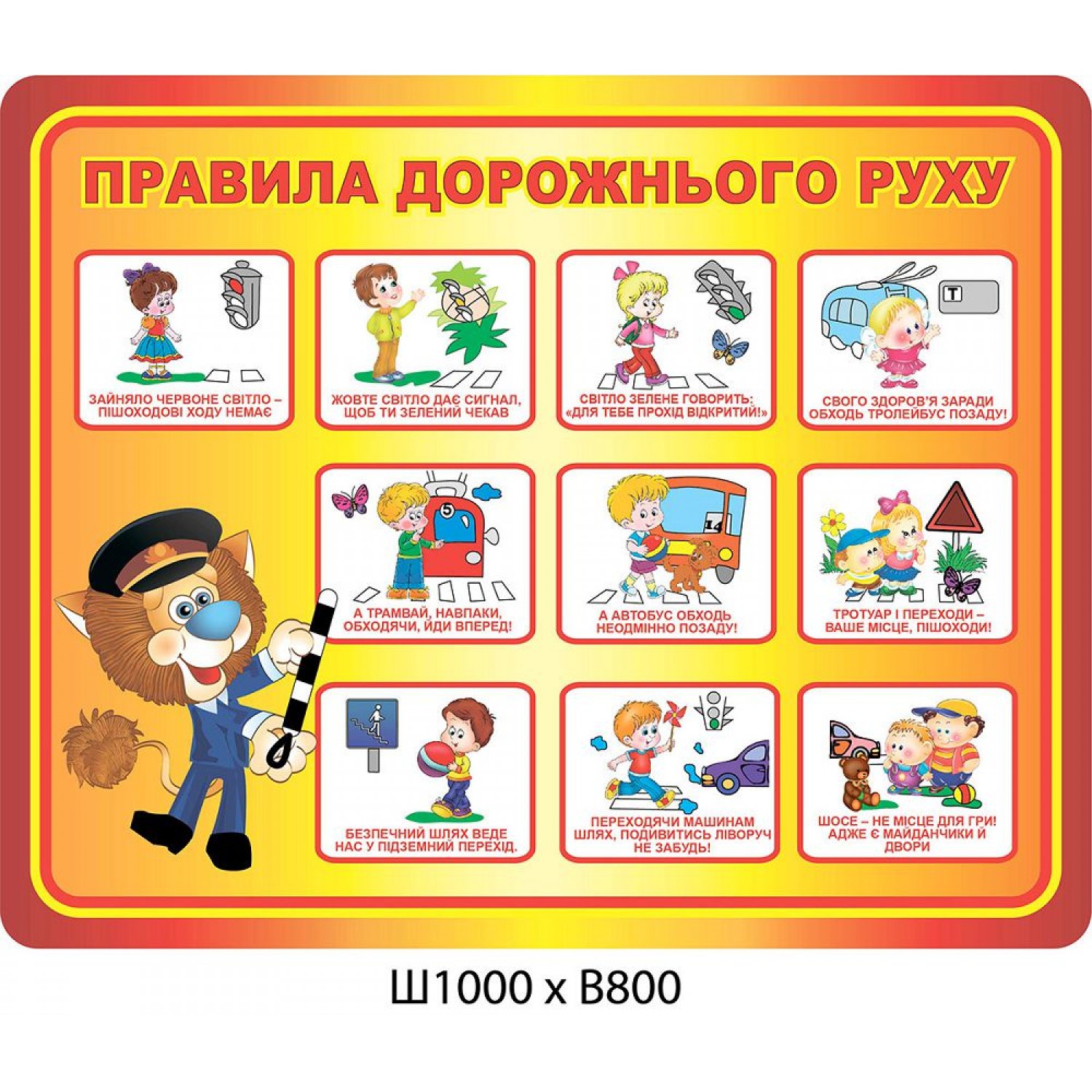Стенд Правила дорожнього руху Поліцейський допоможе візуальному сприйняттю і в прикладах з 10 картинок розповість як потрібно переходити дорогу, що означає червоний, жовтий і зелений кольори, з якого боку безпечно обходити автобус або інший транспорт. Стенд буде корисний для дітей і дорослих і підійде для дитячих центрів і навчальних закладів.