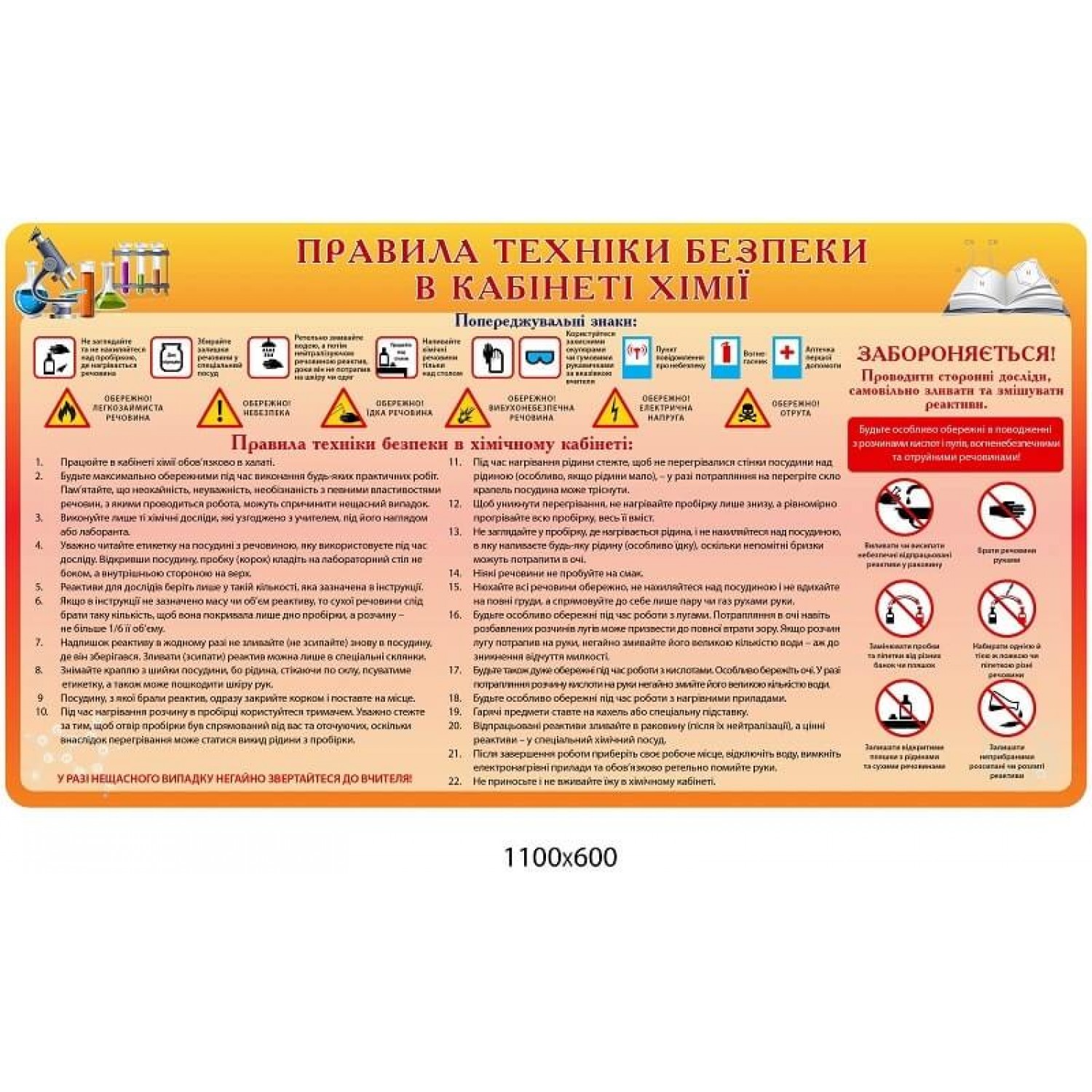 Стенд Правила техніки безпеки у кабінеті хімії ,попереджувальні знаки