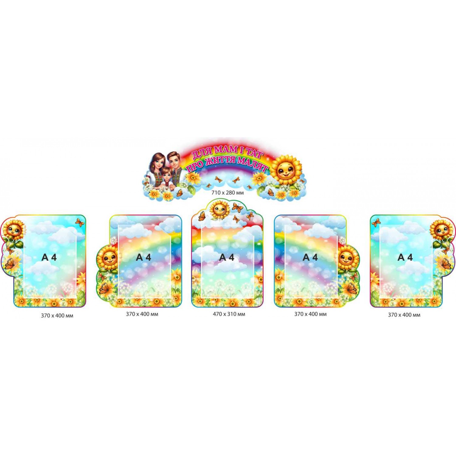 3. Чотирьох інших менших стендів (кожен 370х400 мм), оформлені соняшниками й метеликами на фоні неба та райдуги.