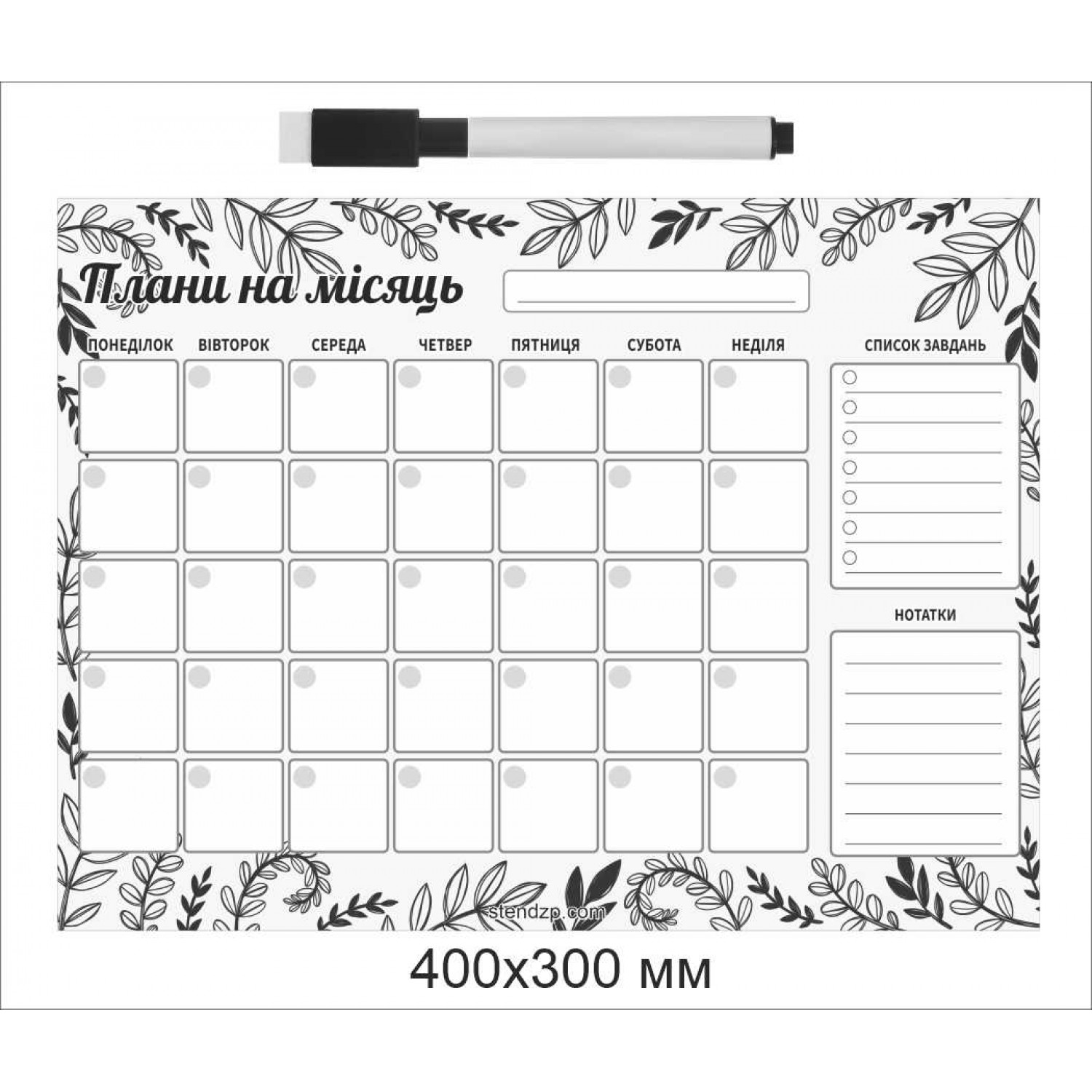 Магнитный планер «Планы на месяц» от компании Стенд Дизайн Украина — это идеальный способ организовать своё время. Планер размером 400×300 мм легко крепится на холодильник или другую металлическую поверхность. Поверхность многоразовая — записи стираются сухим маркером без следов. Планер включает удобную сетку на 5 недель, раздел для списка заданий и заметок. Элегантный чёрно-белый дизайн с растительными мотивами гармонично впишется в любой интерьер. В комплект входит маркер со стирателем. Практичное решение для дома, офиса или учебы